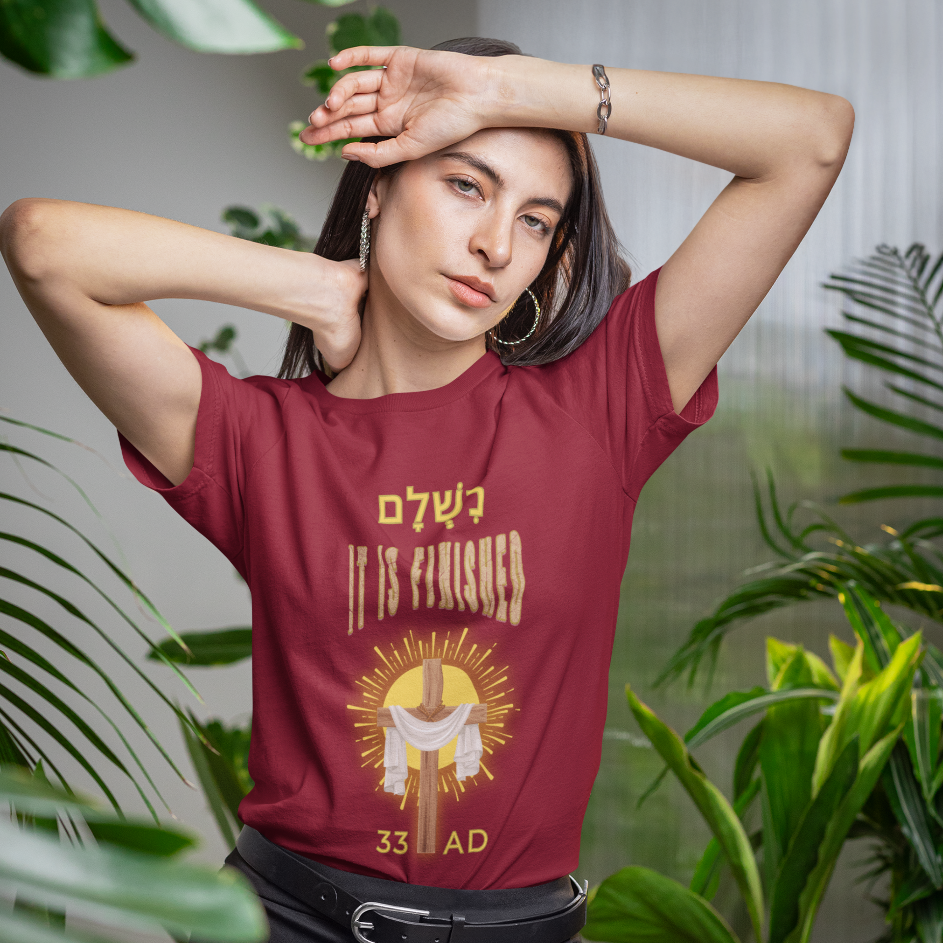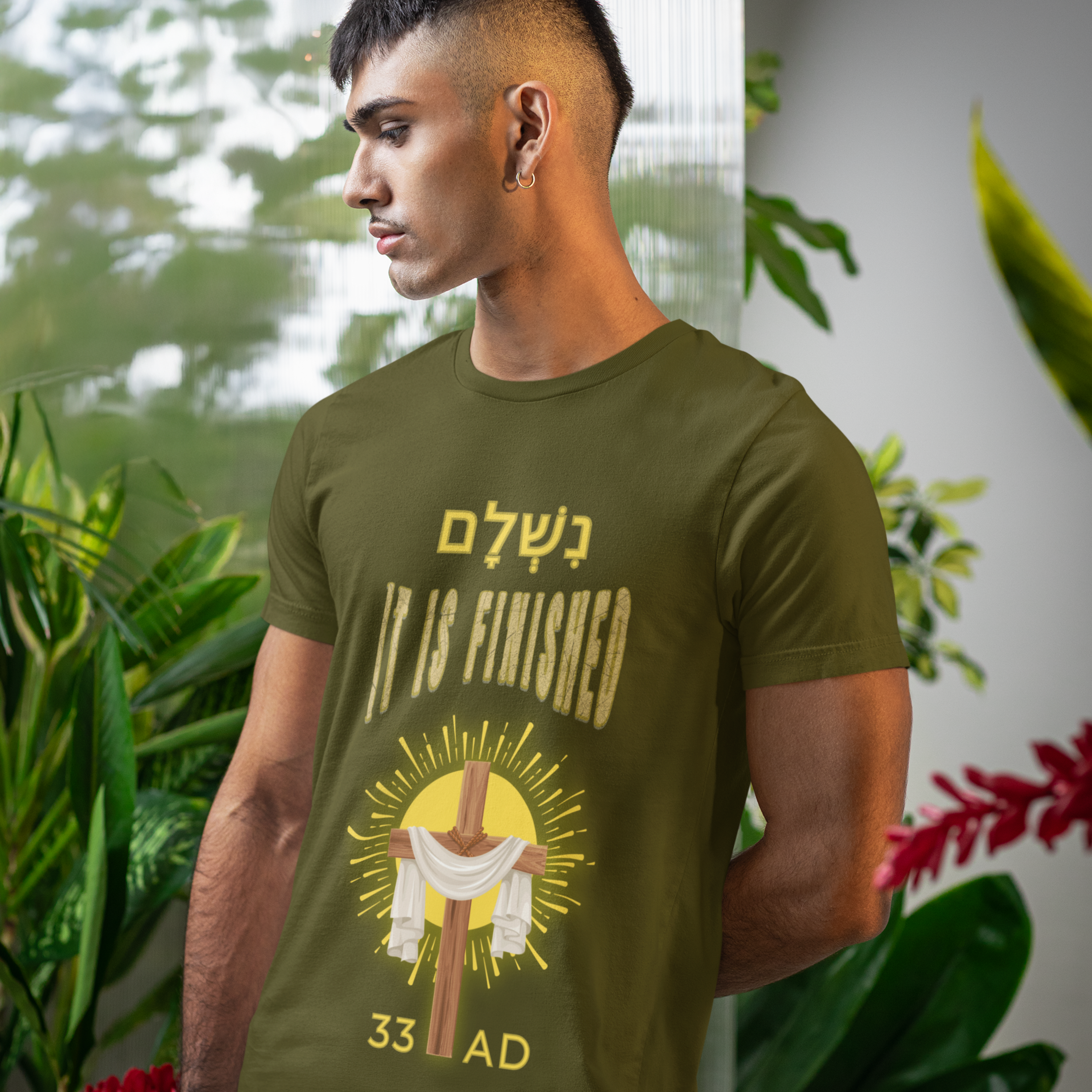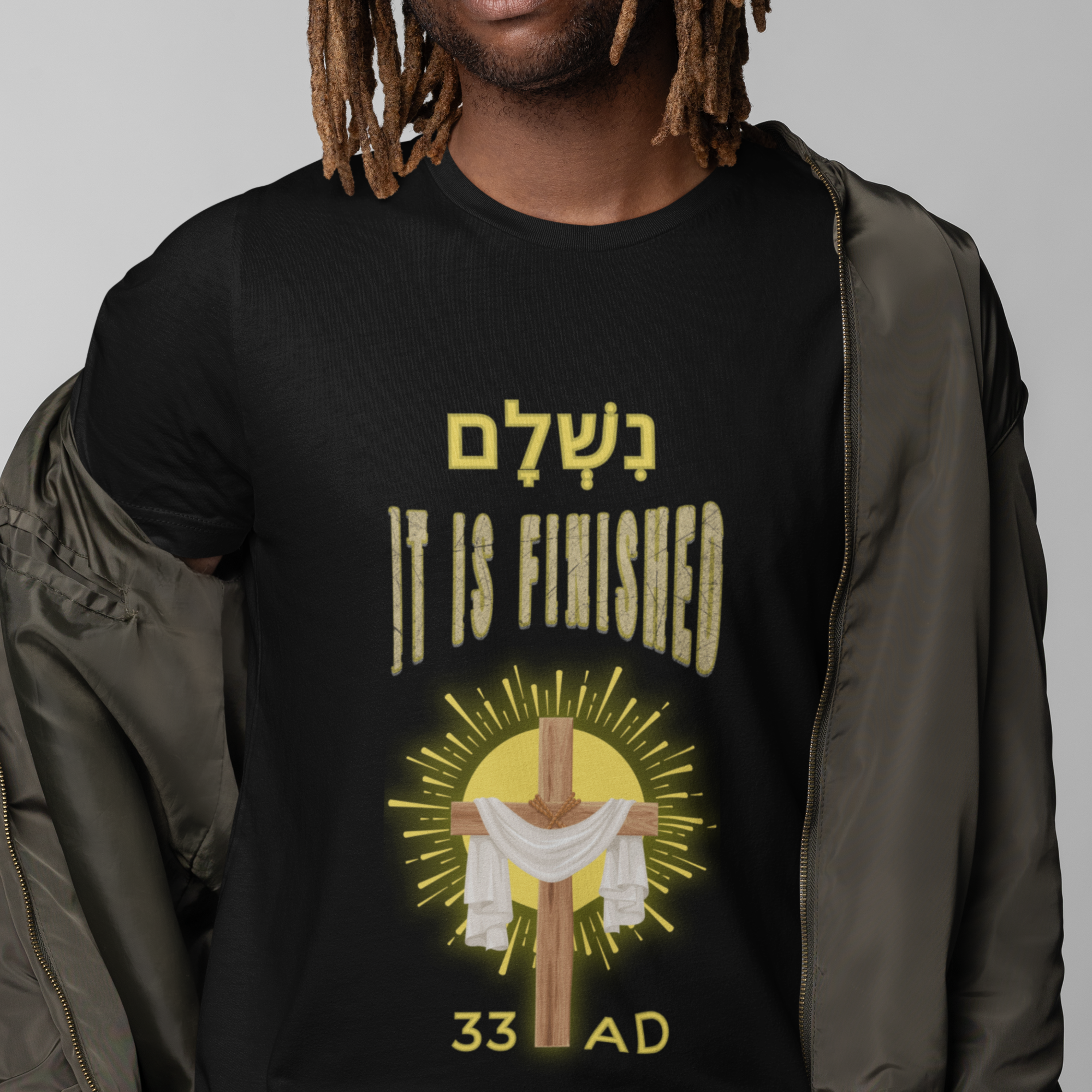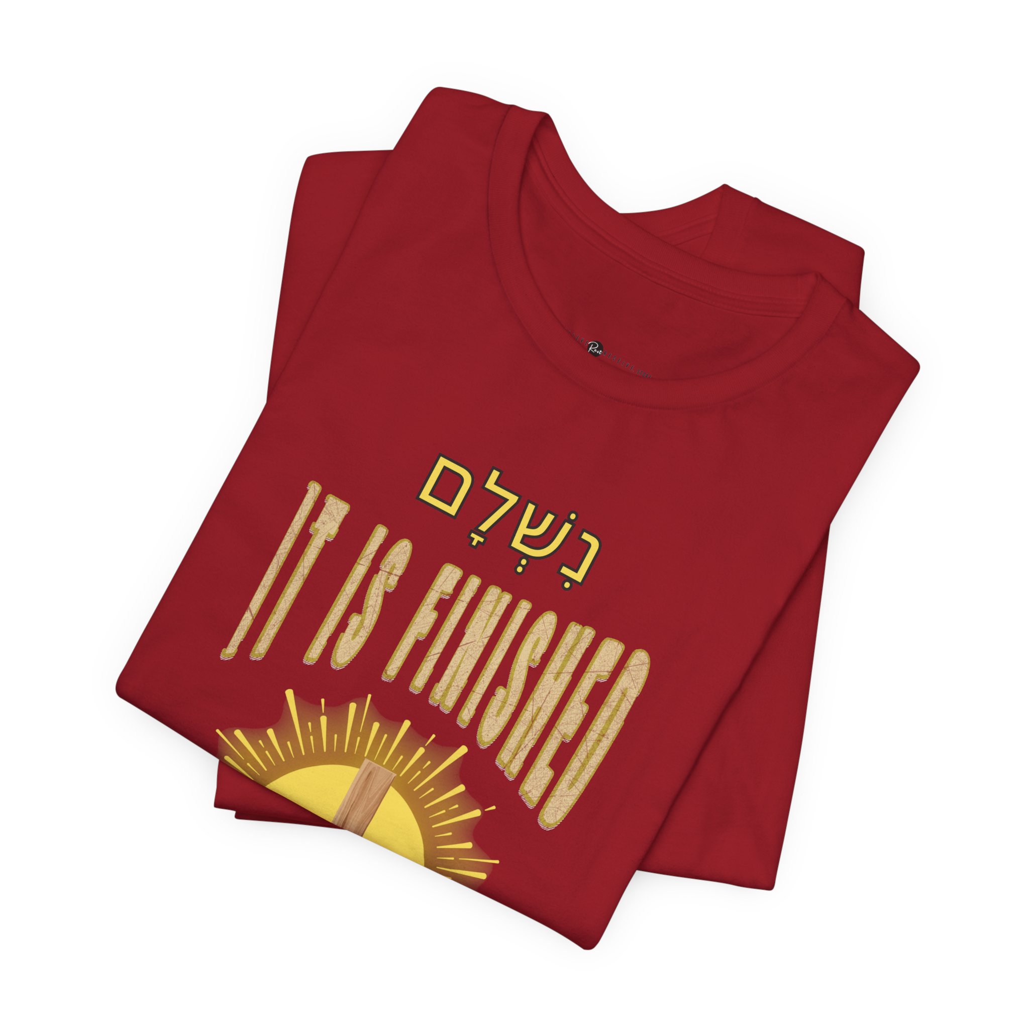 The unique design of this tee features the Hebrew word Nishlam (נִשְׁלָם) which means “it is finished,” “completed,” or “paid in full.” It is famously associated with the final words of Jesus on the cross, representing the completion of His mission.