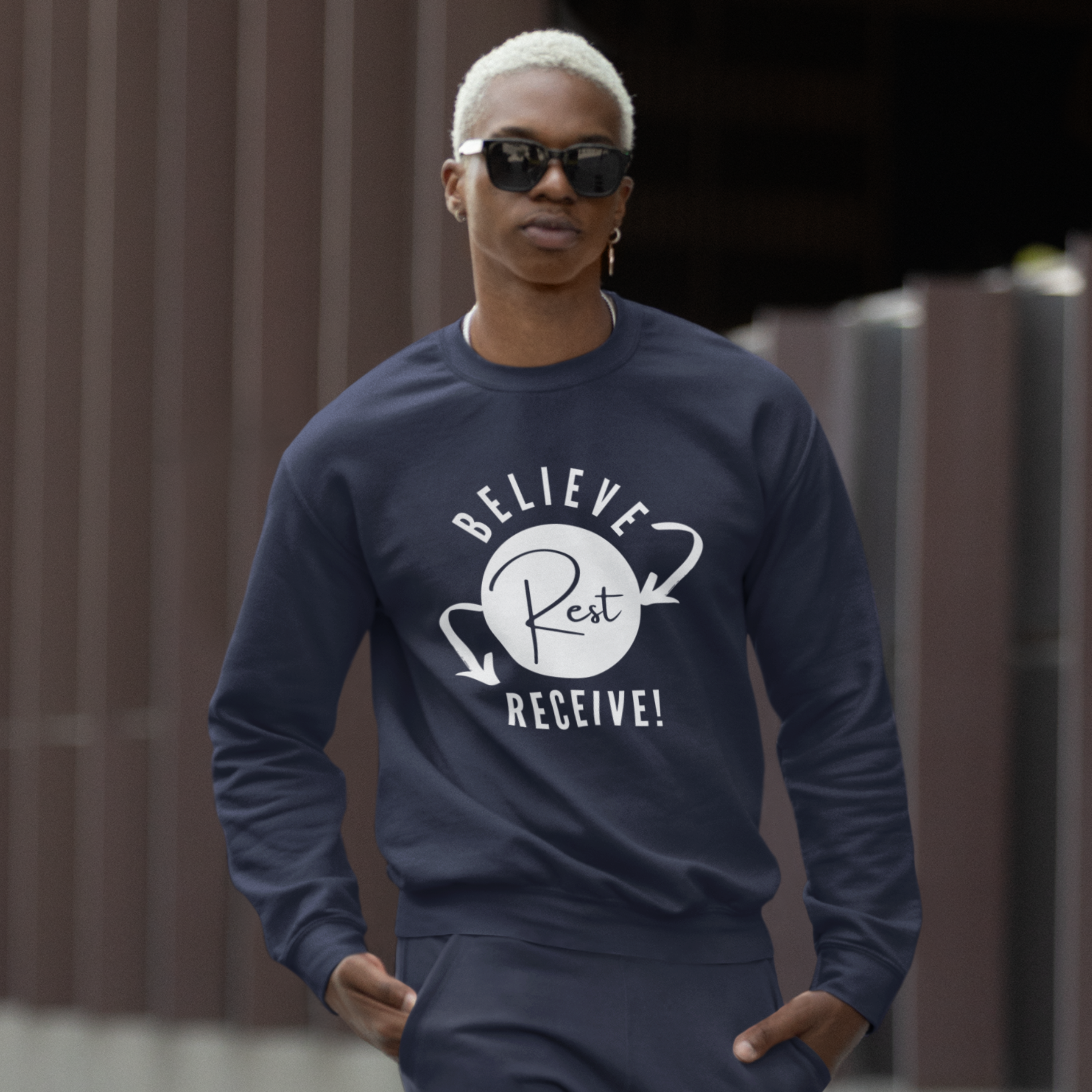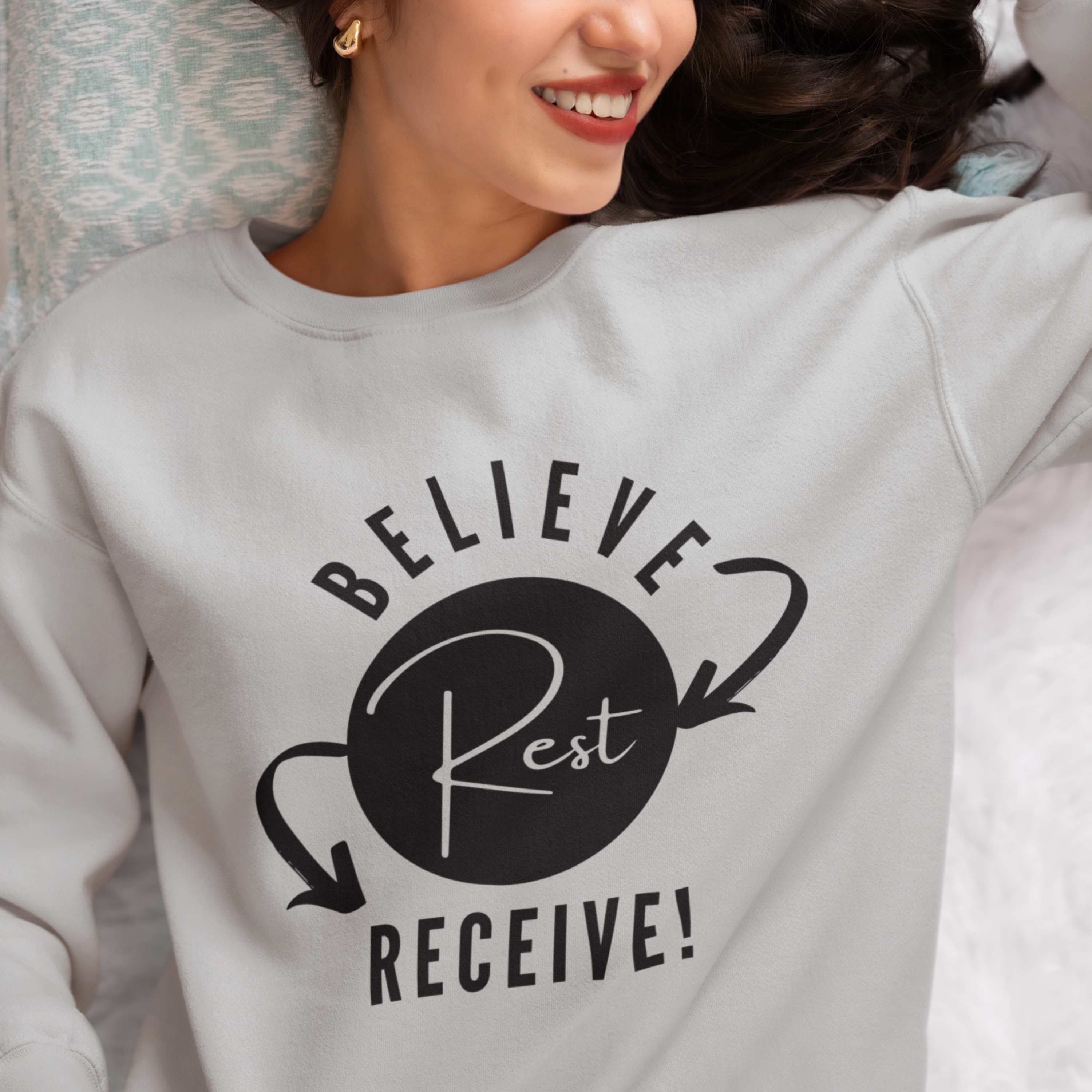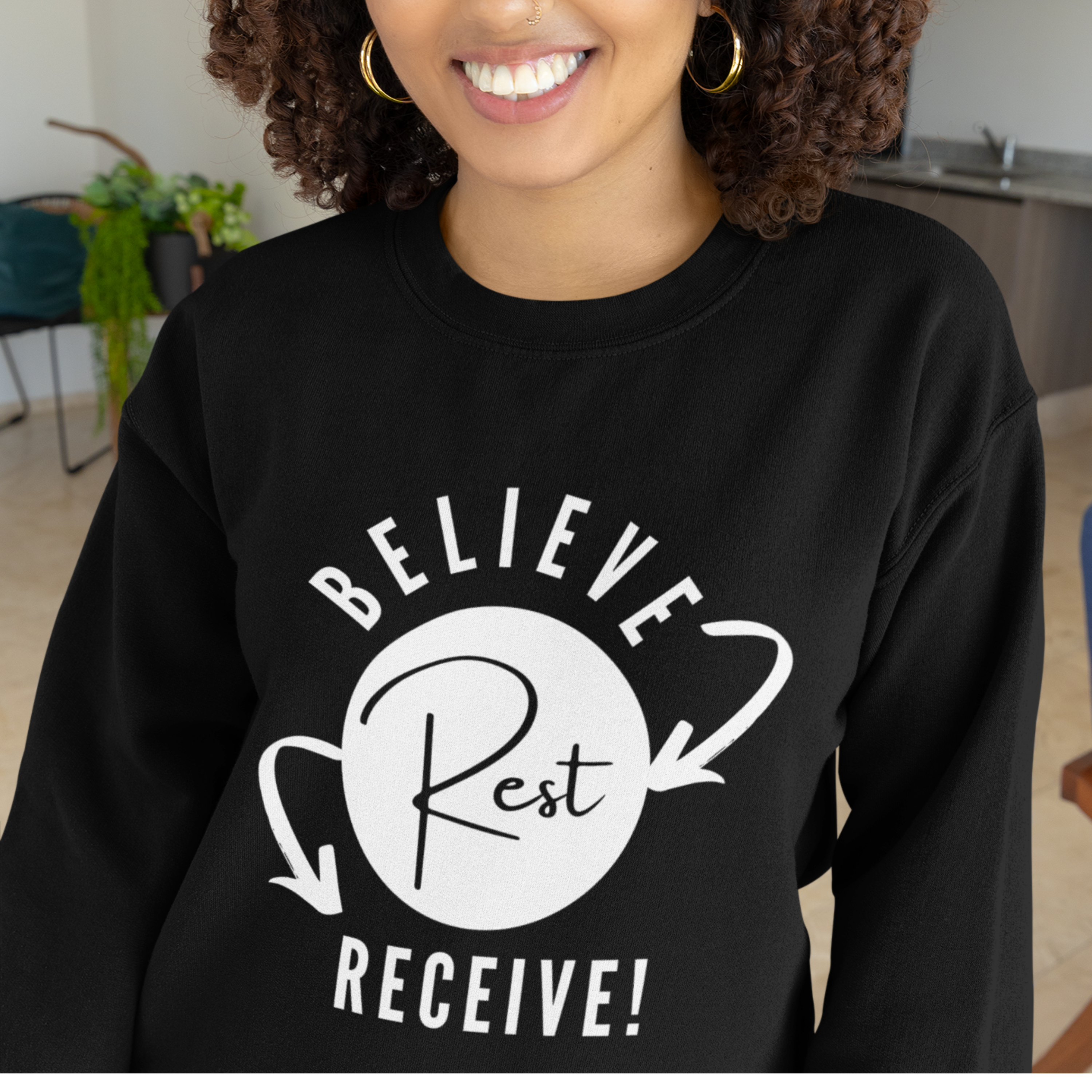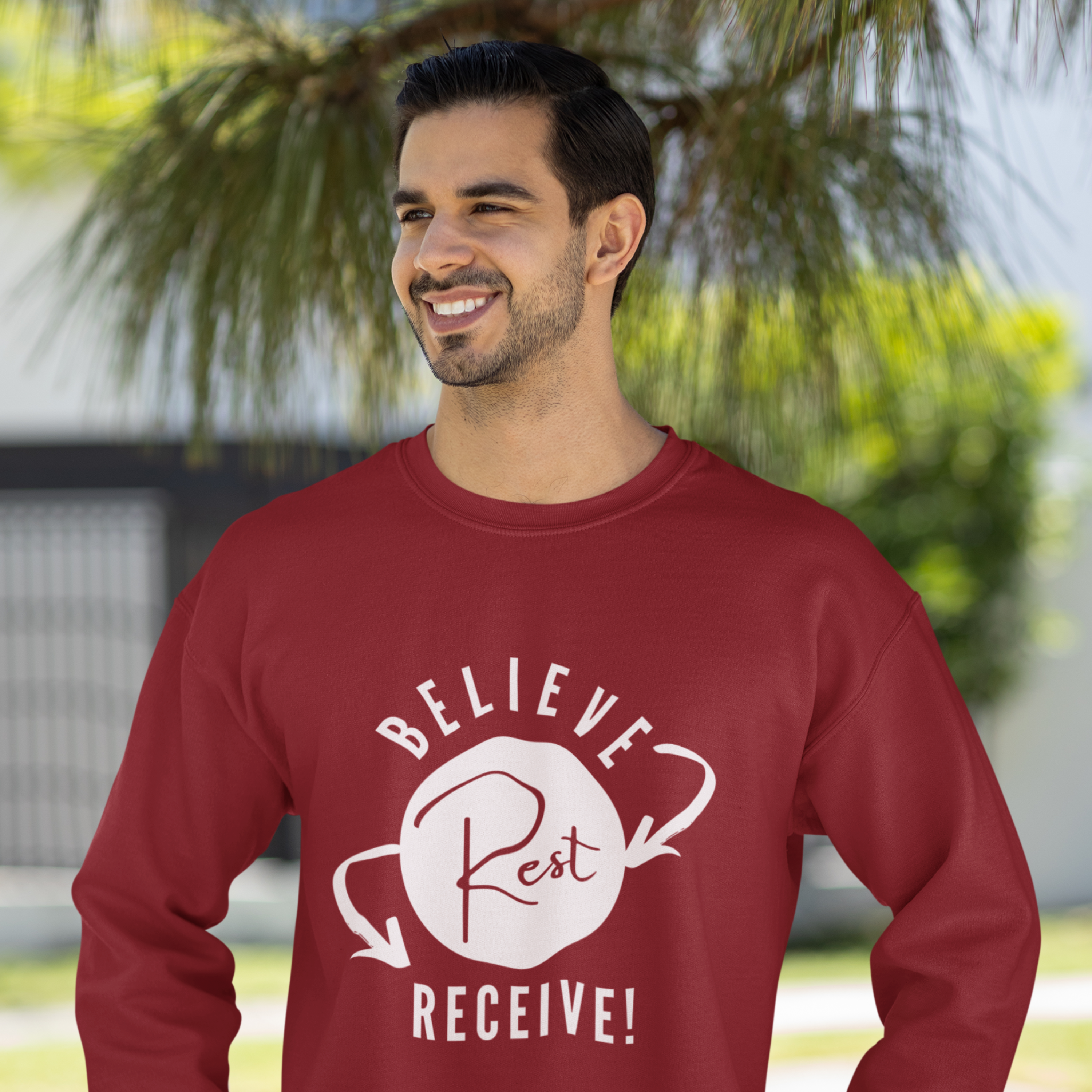 Carry the comforting truth of your faith journey wherever you go. This Believe-Rest-Receive! sweatshirt showcases the distinctive “Roadmap of Faith” graphic, a daily wearable reminder to Believe God’s word, settle into His Rest, and confidently Receive what He has promised.