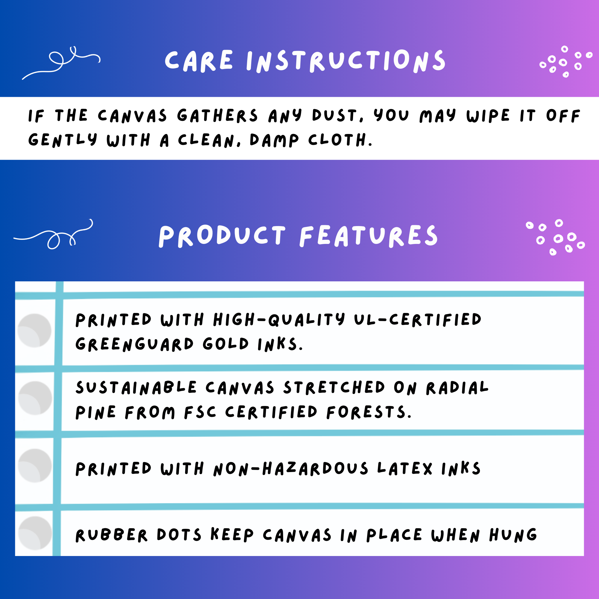 Care instructions: If the canvas does gather any dust, you may wipe it off gently with a clean, damp cloth.