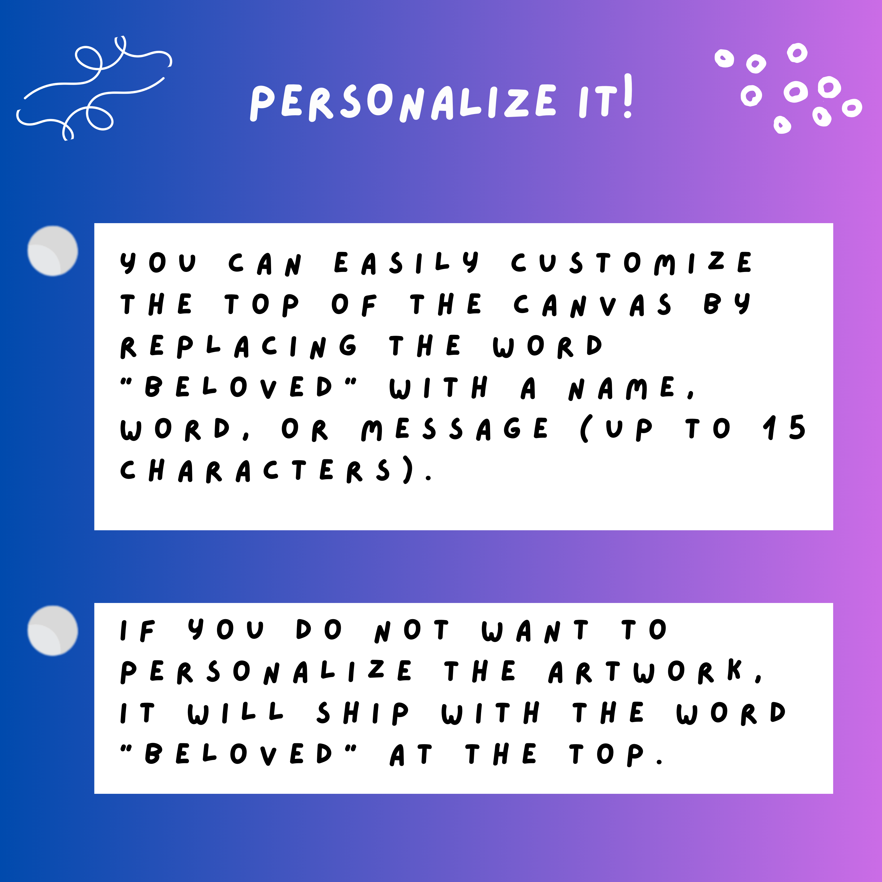 You can customize the top of the canvas with a name, word, or message (up to 15 characters). If you do not personalize it, the art will ship with “Beloved” at the top.