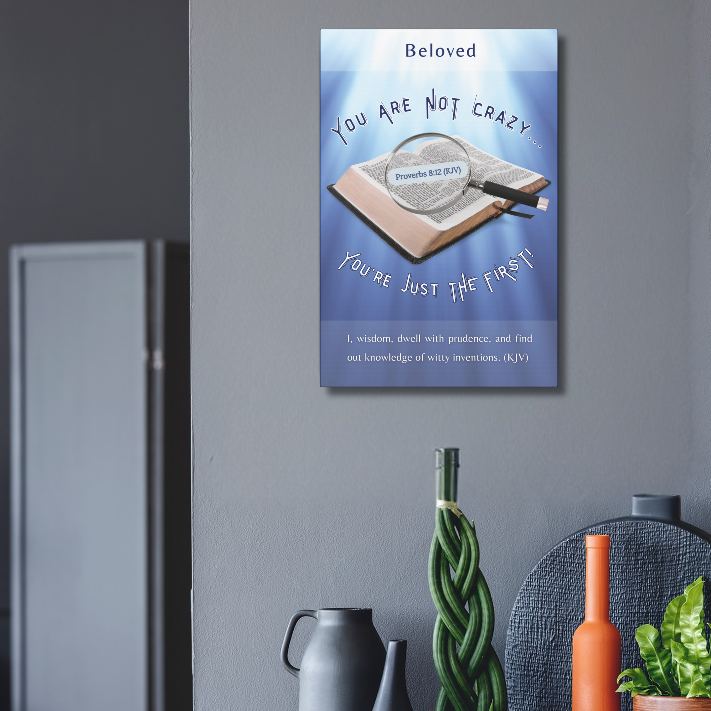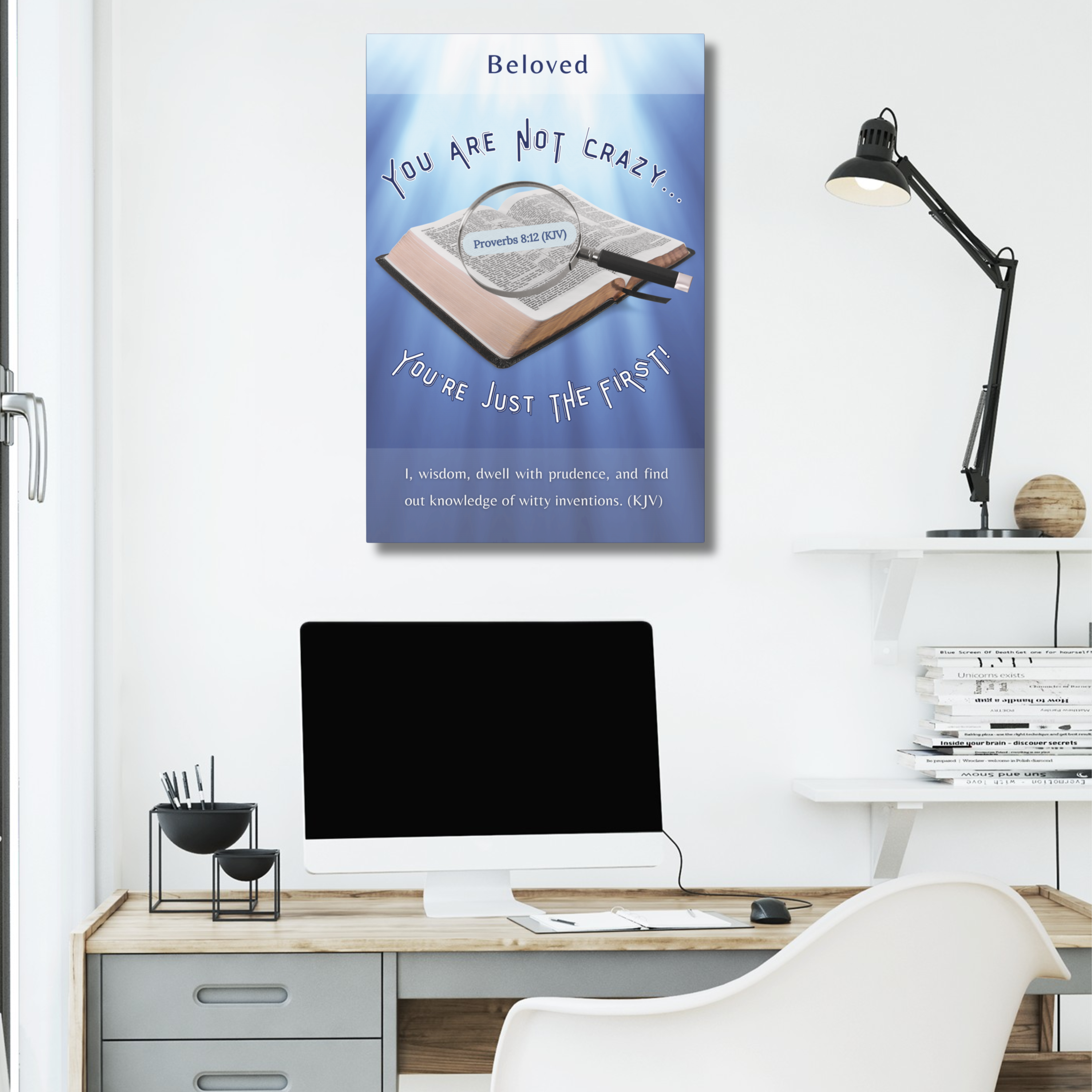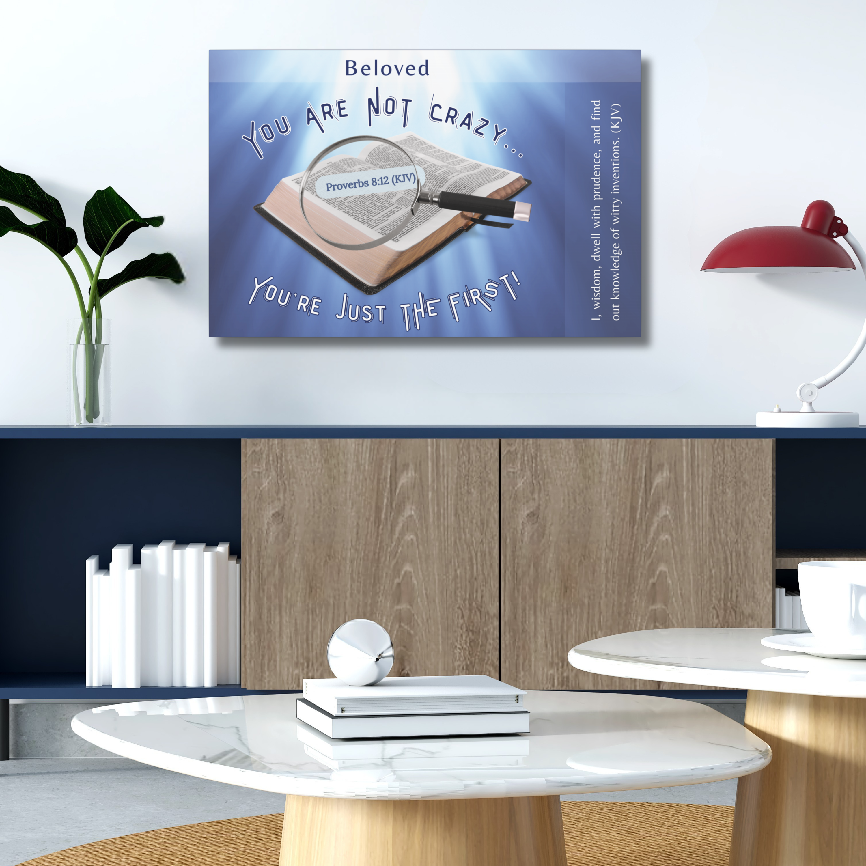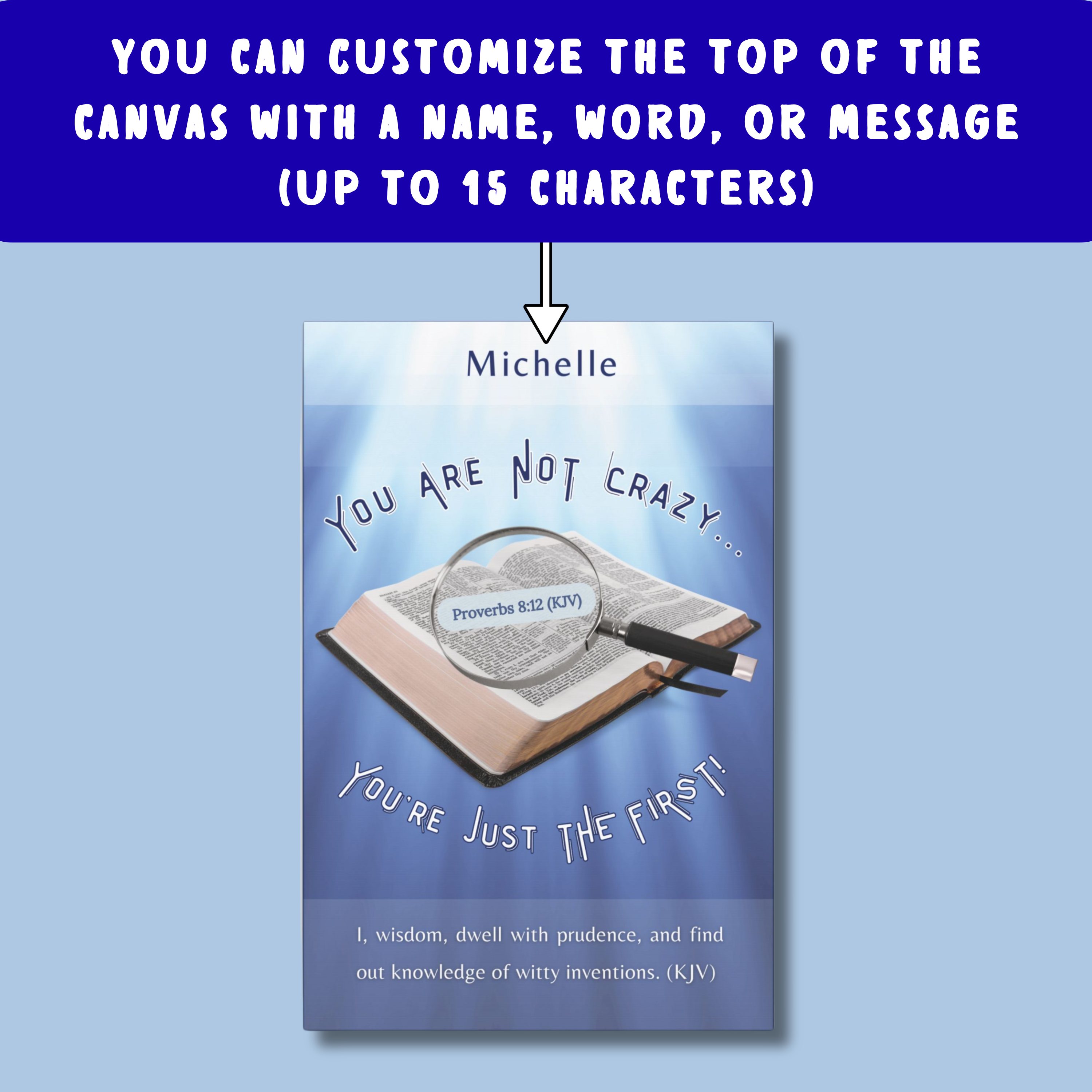 VERTICAL OR HORIZONTAL MATTE CANVAS: Personalizable “You Are NOT Crazy – God Says You’re Just THE FIRST!” Canvas Wall Art | Proverbs 8:12 Scripture Art | Blue Matte Faith-Inspired Decor