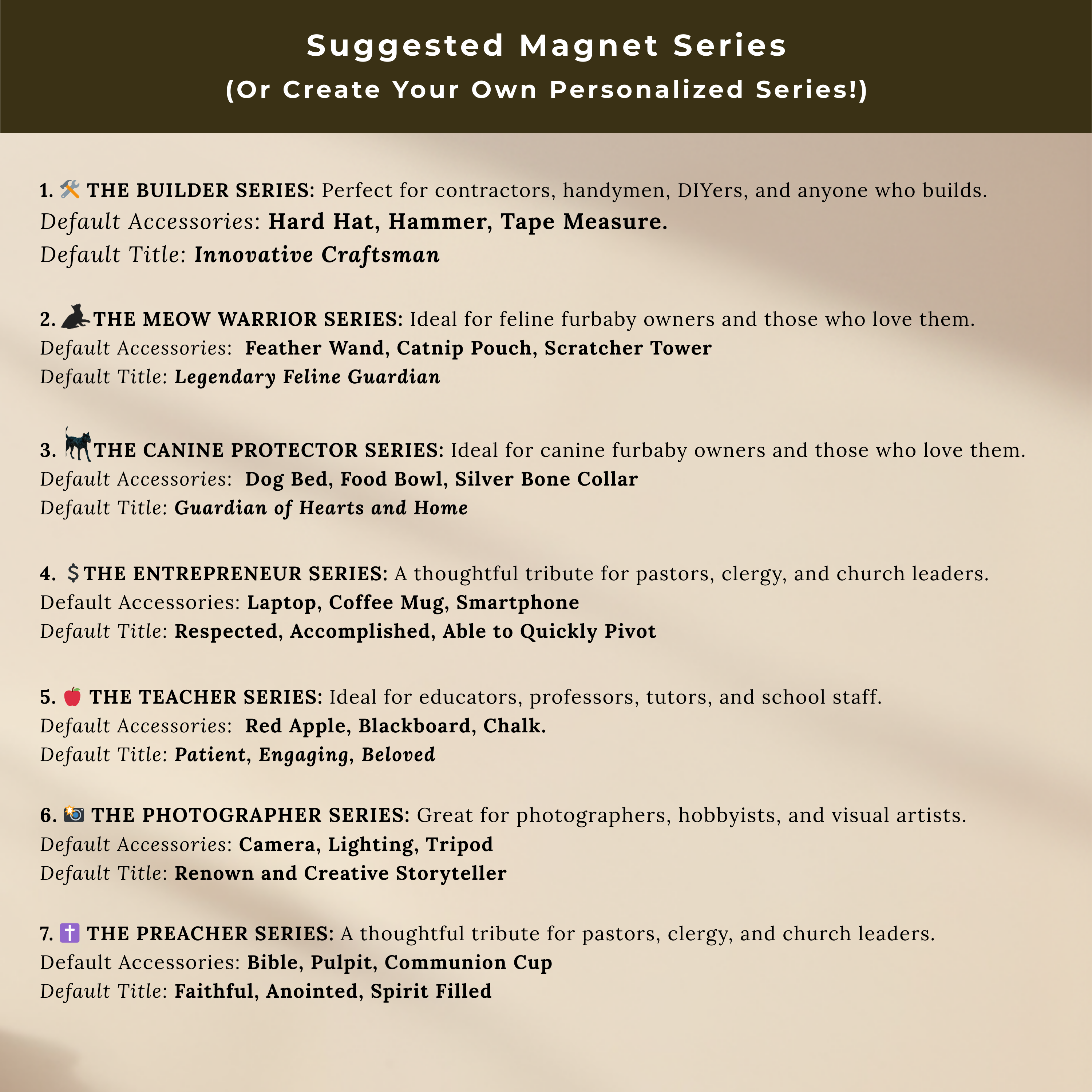Choose a Suggested Series from the dropdown menu (Builder, Meow Warrior, Canine Protector, Entrepreneur, Teacher, Photographer, Preacher), or Create Your Own Custom Series