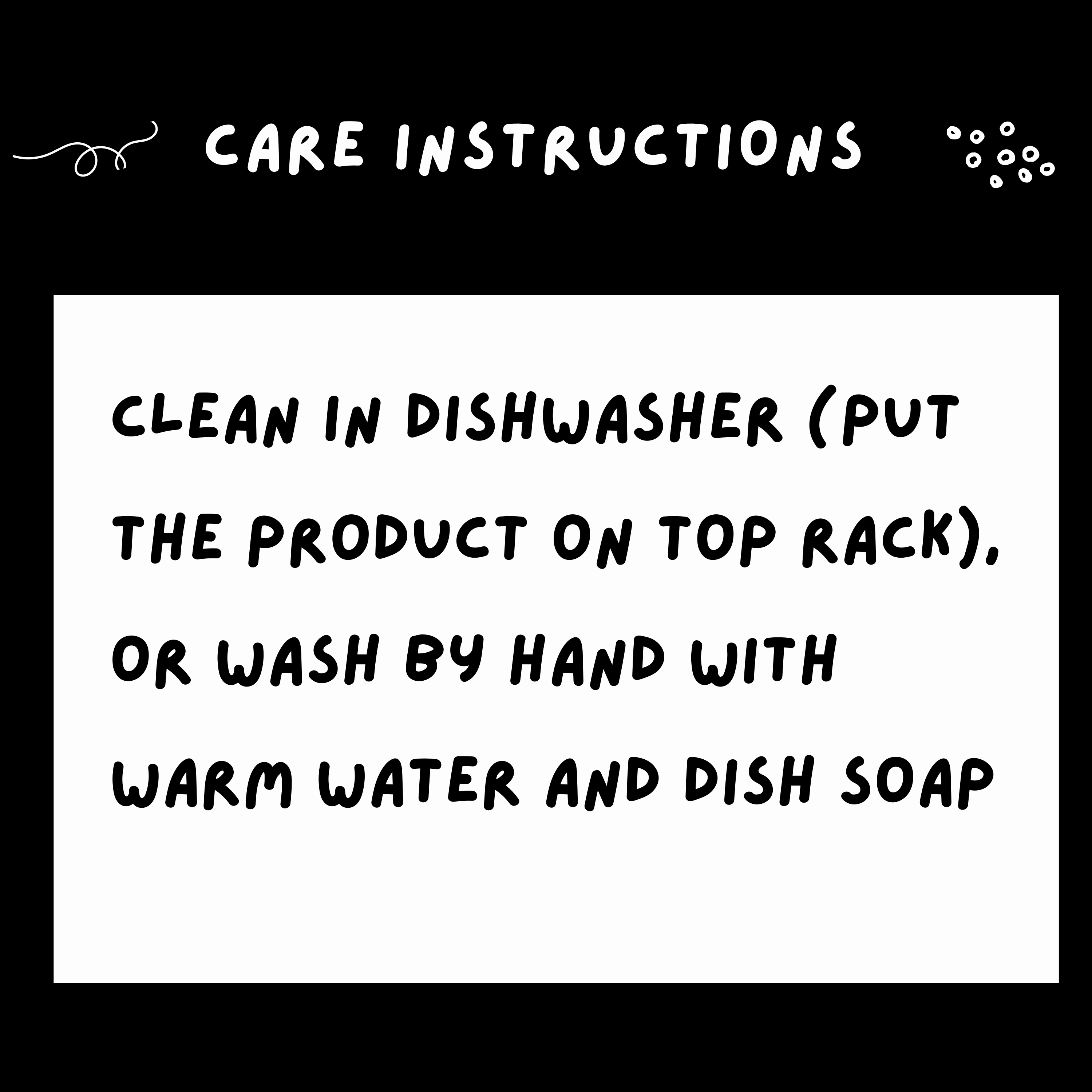 Care instructions: Clean in dishwasher (put the product on top rack), or wash by hand with warm water and dish soap