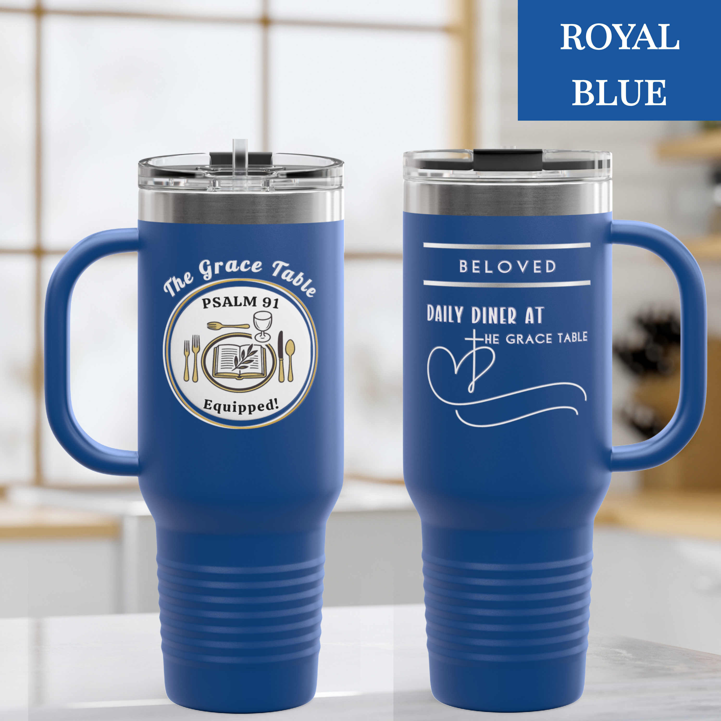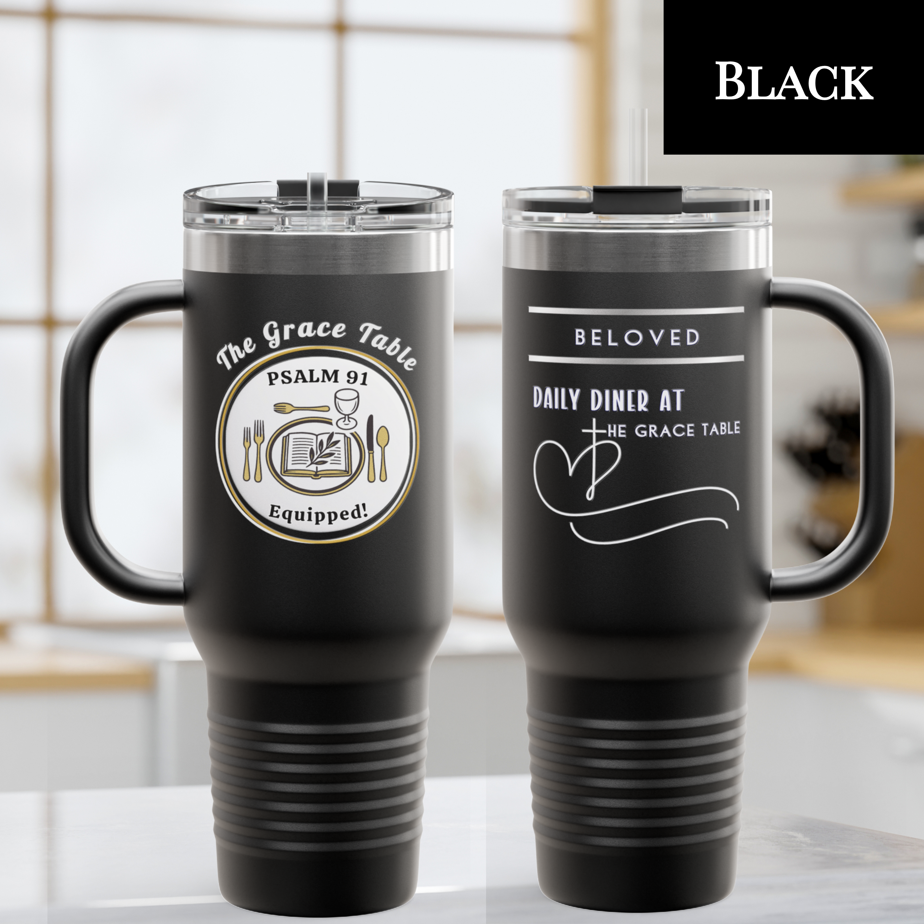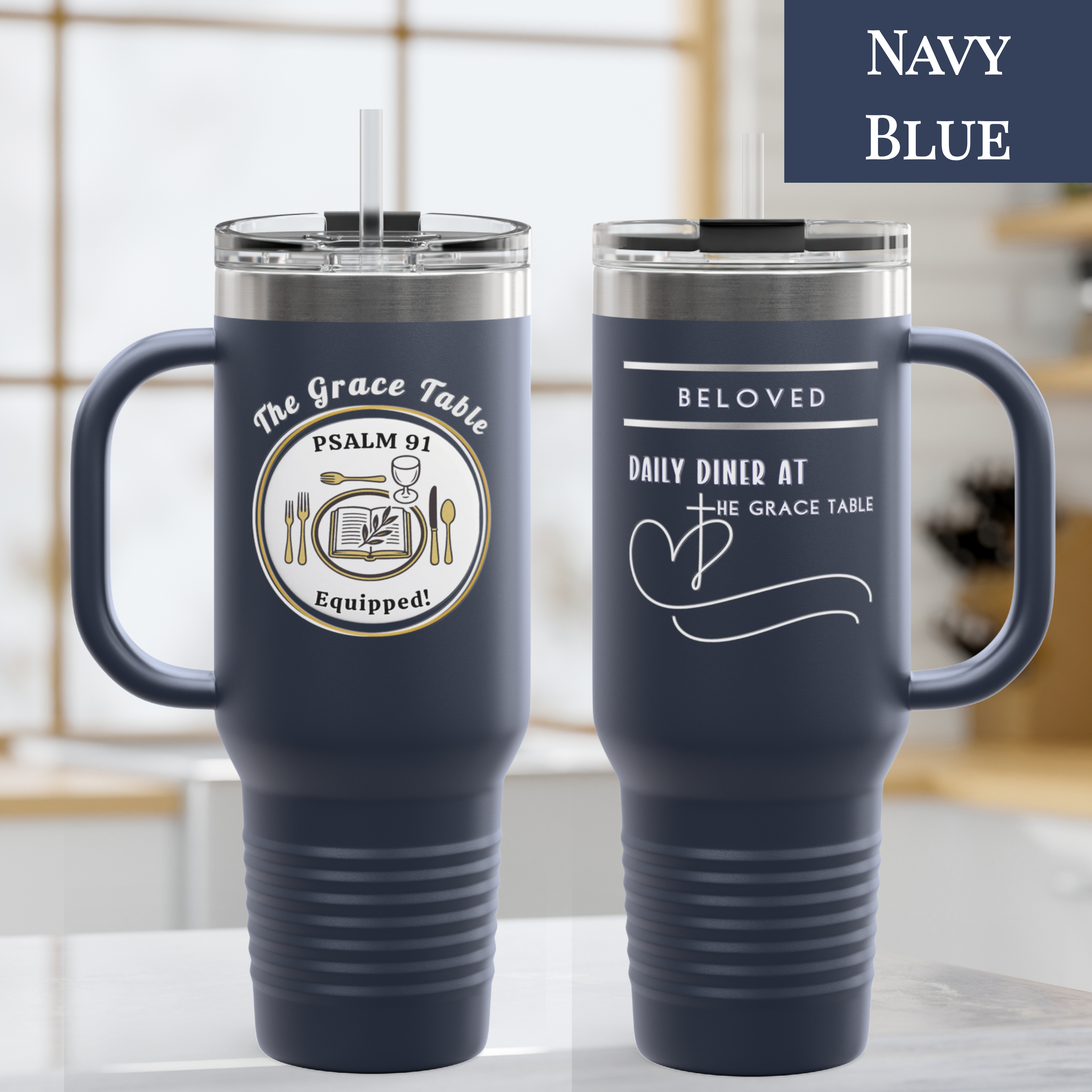 This 40 oz tumbler is designed to keep your favorite drinks at the perfect temperature while boldly displaying your faith. Featuring the signature Daily Diner heart and cross graphic on one side, and the Psalm 91 Equipped table setting on the other, this large-capacity tumbler is both a statement of belonging and a daily reminder that you are God’s Beloved.