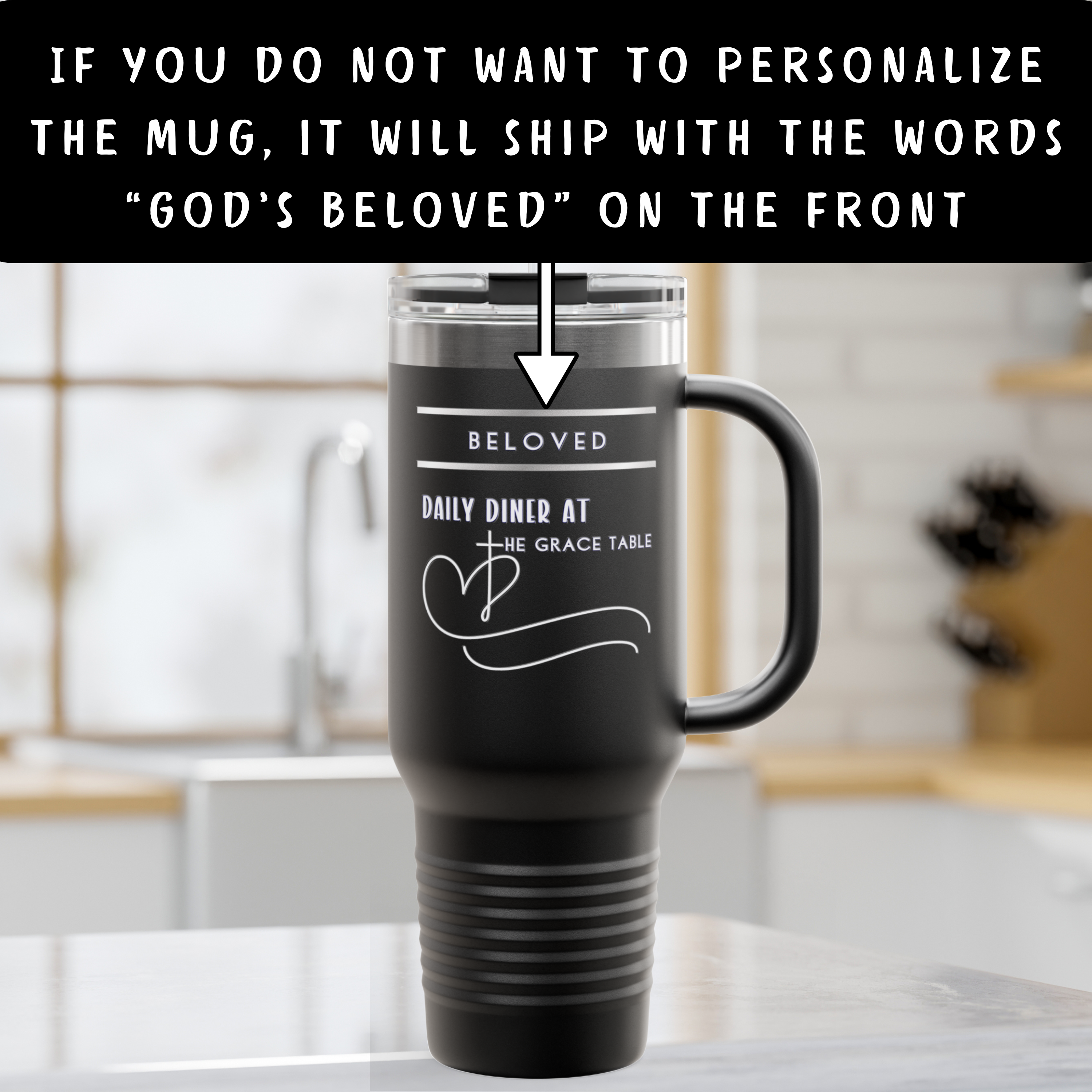 You can easily customize the top of the mug with a name, encouraging word, or custom message (up to 15 characters). If no personalization is provided, it will ship with the words “God’s Beloved” at the top.