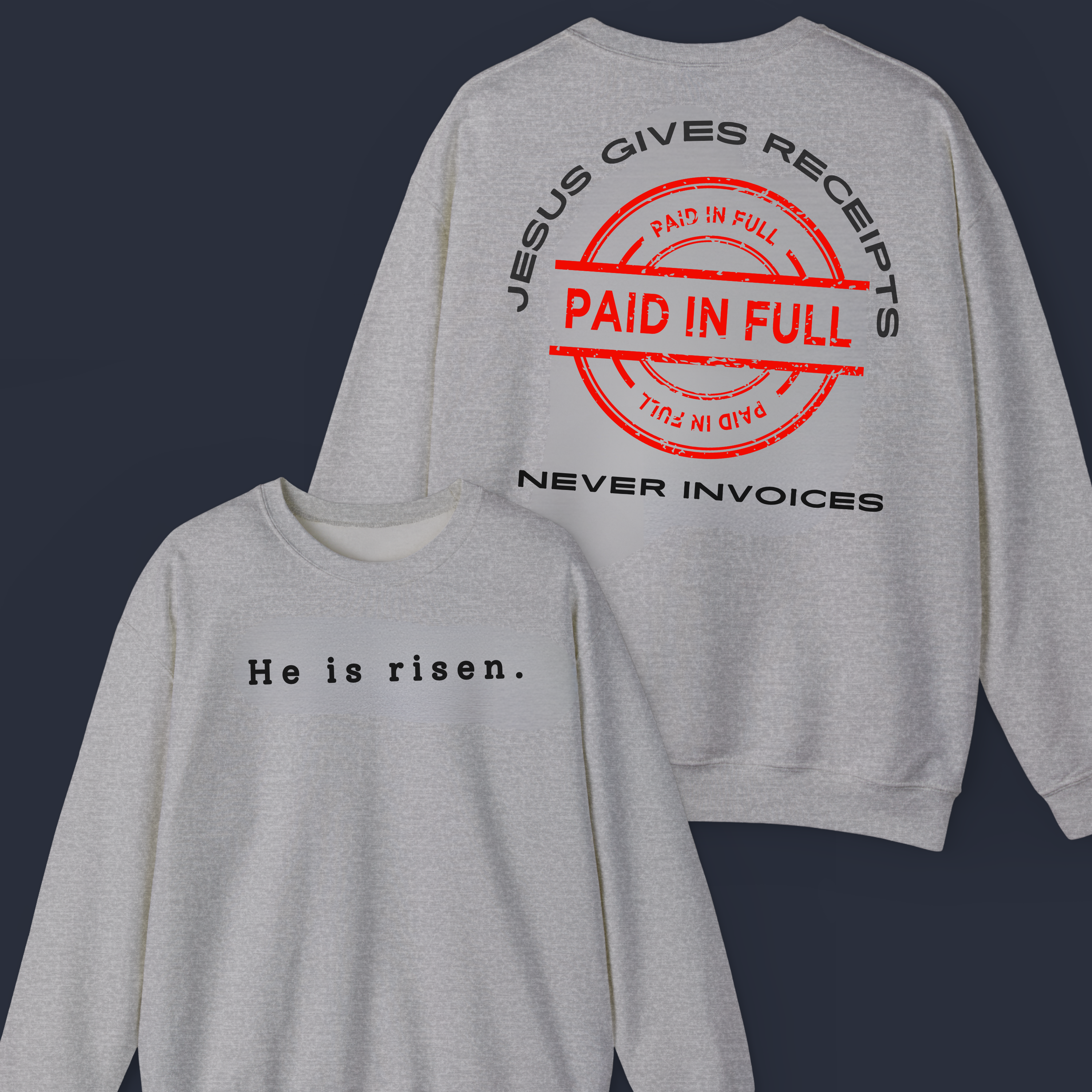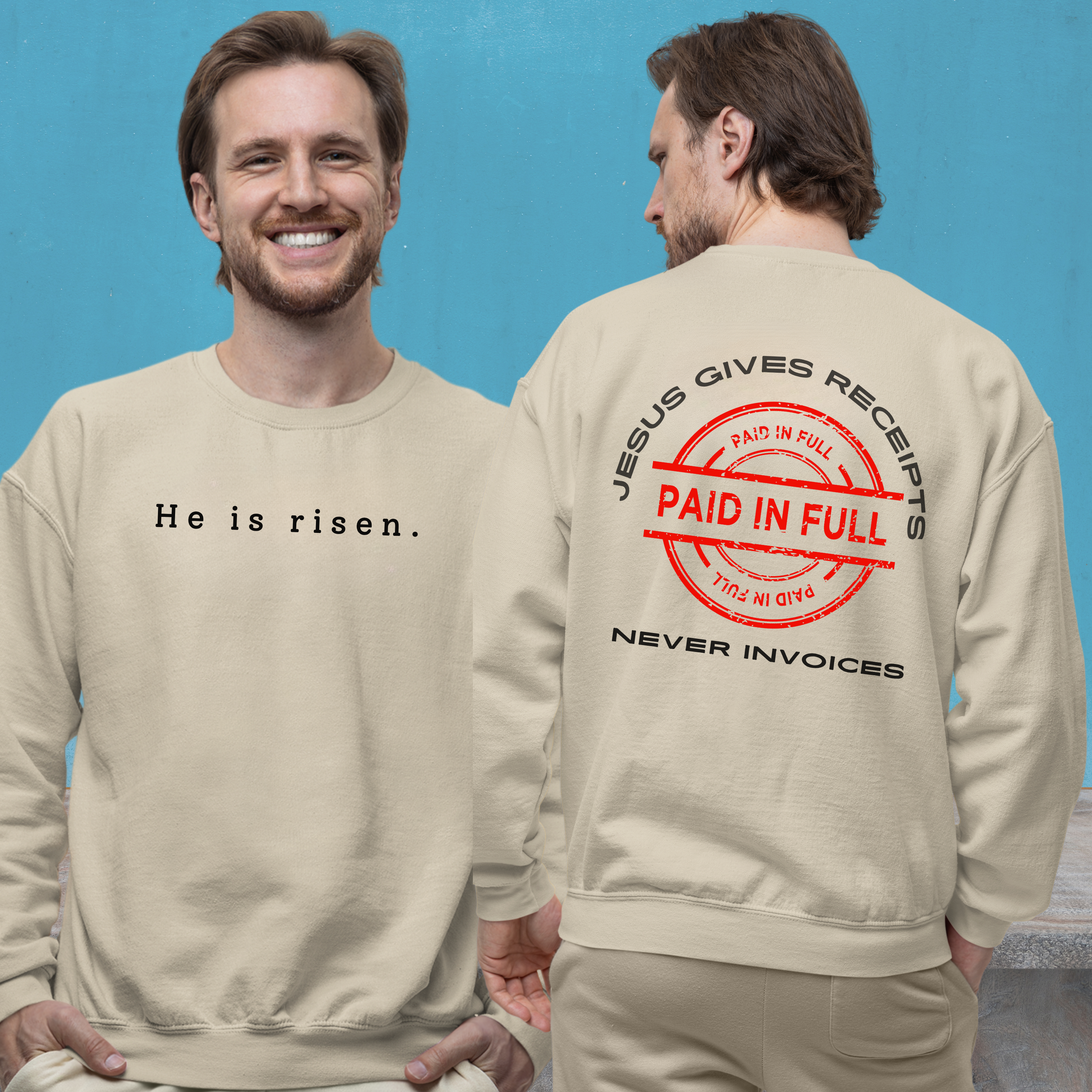Spread the message of faith and redemption with our eye-catching “Jesus Gives Receipts – Never Invoices” Gildan 18000 Sweatshirt.