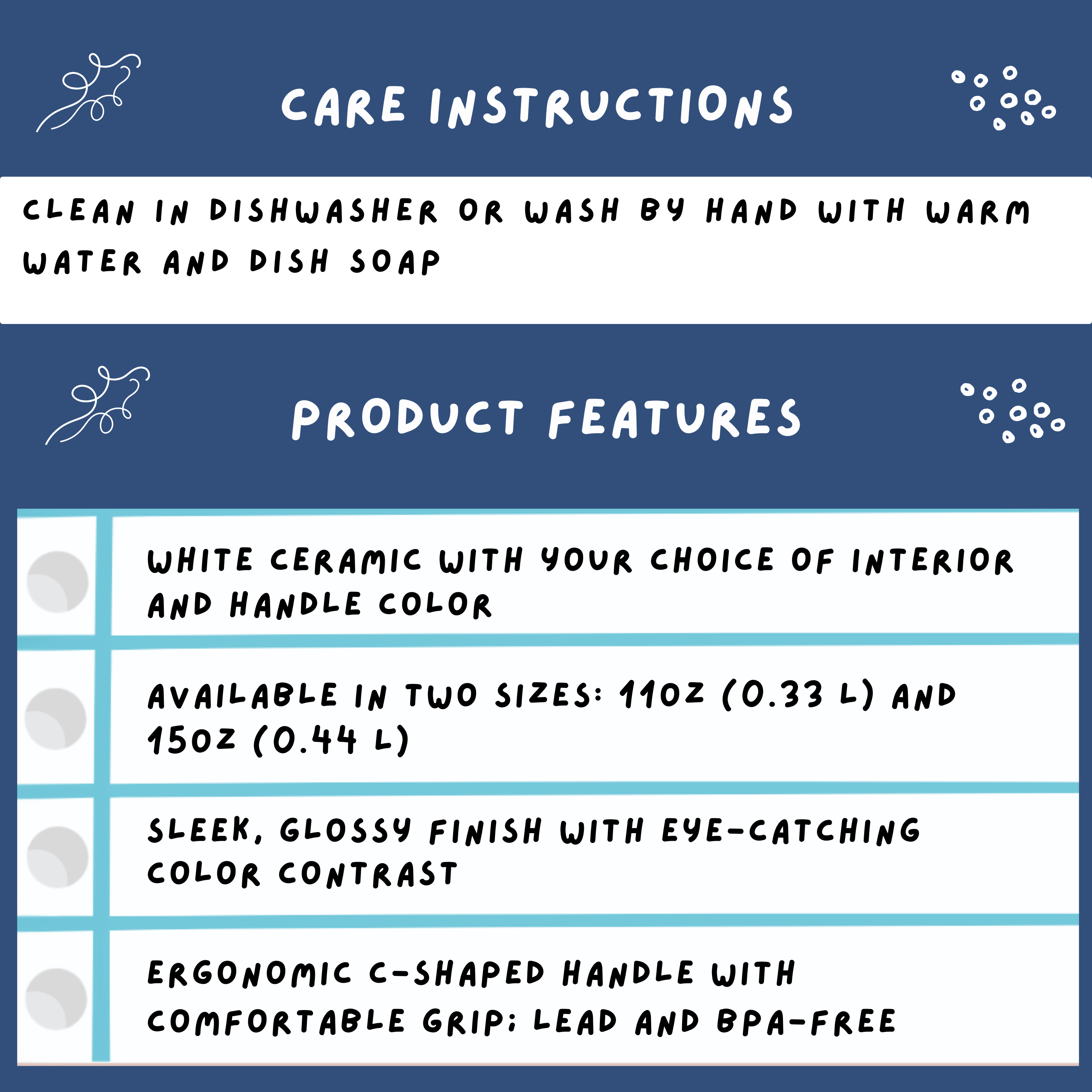 You can customize the front of the mug with a name, word, or message (up to 15 characters). If you do not personalize it, the mug will ship with “Beloved” on the front.