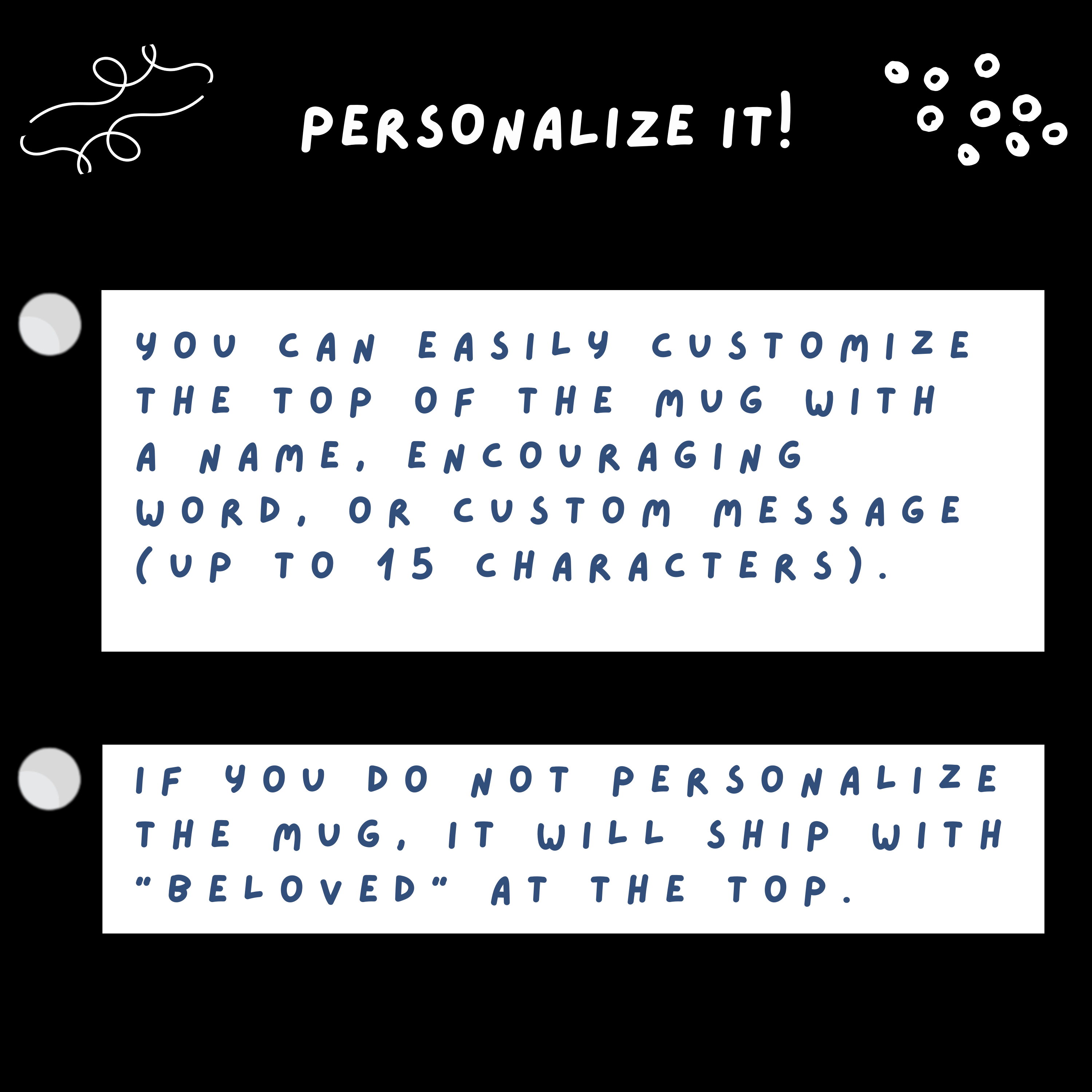 You can customize the top of the mug with a name, word, or message (up to 15 characters). If you do not personalize it, the mug will ship with “Beloved” at the top.