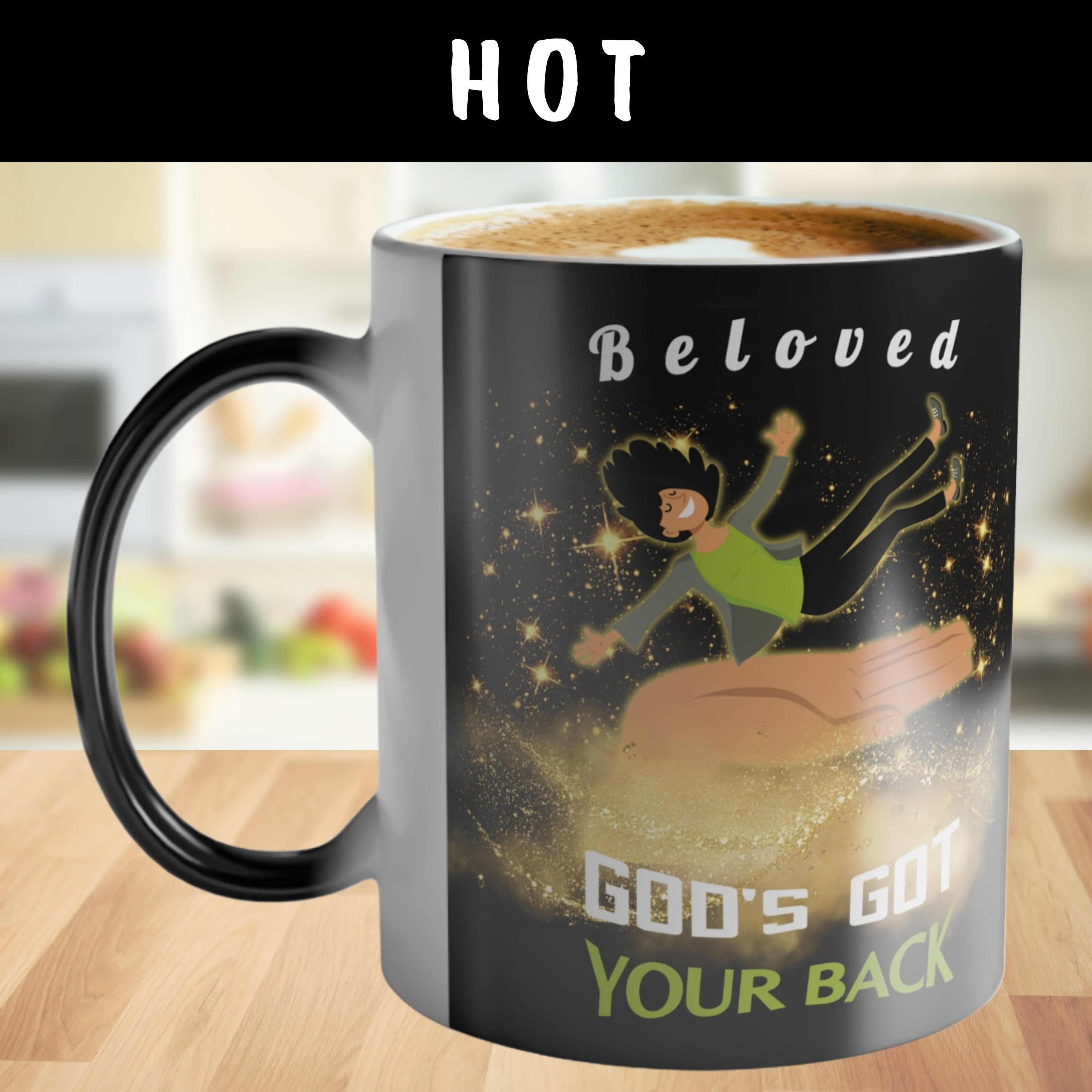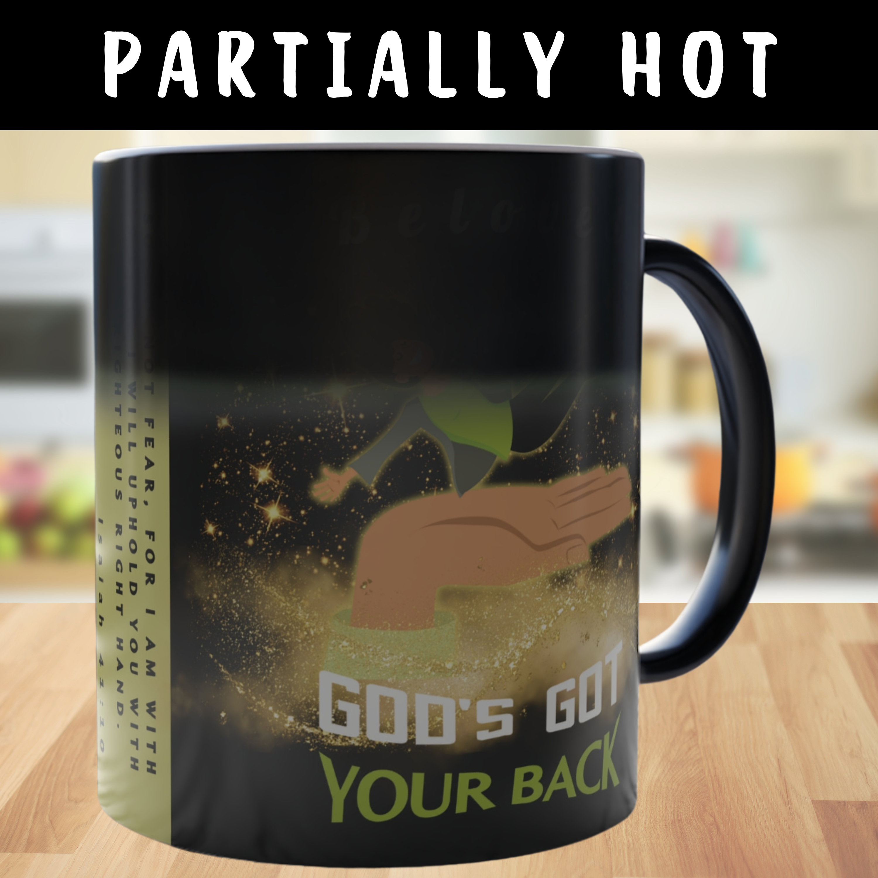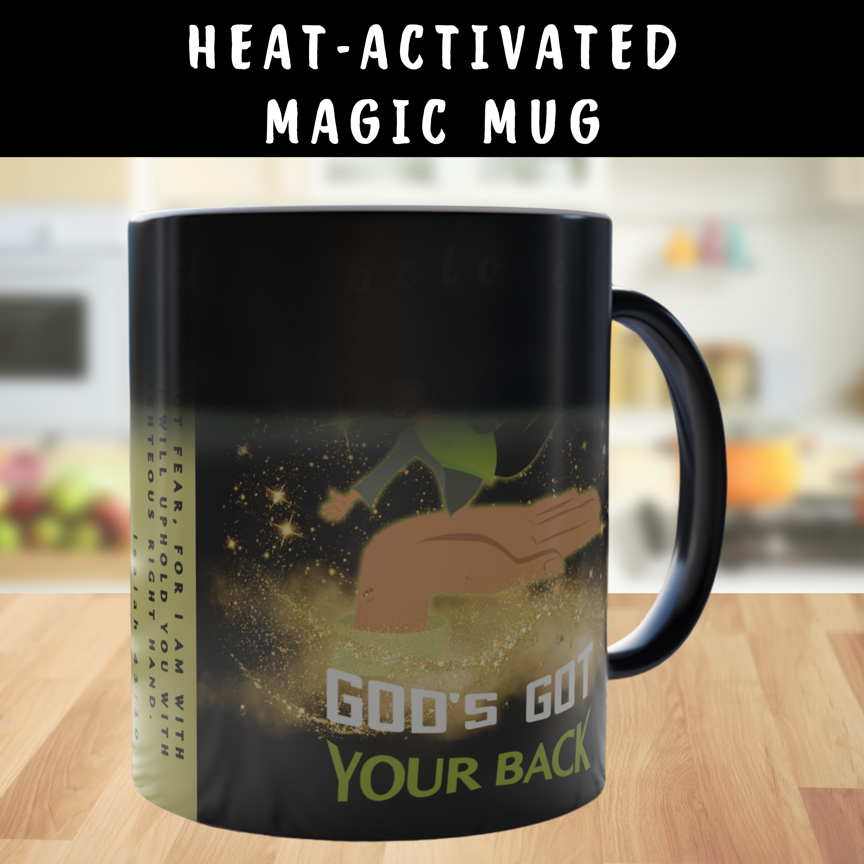 This “God’s Got Your Back” color-changing mug transforms before your eyes—revealing a powerful illustration of a joyful fair-skinned woman falling safely onto God’s Righteous Right Hand. As the mug heats up, golden stars shimmer across a rich black background, along with the bold reminder from Isaiah 41:10: