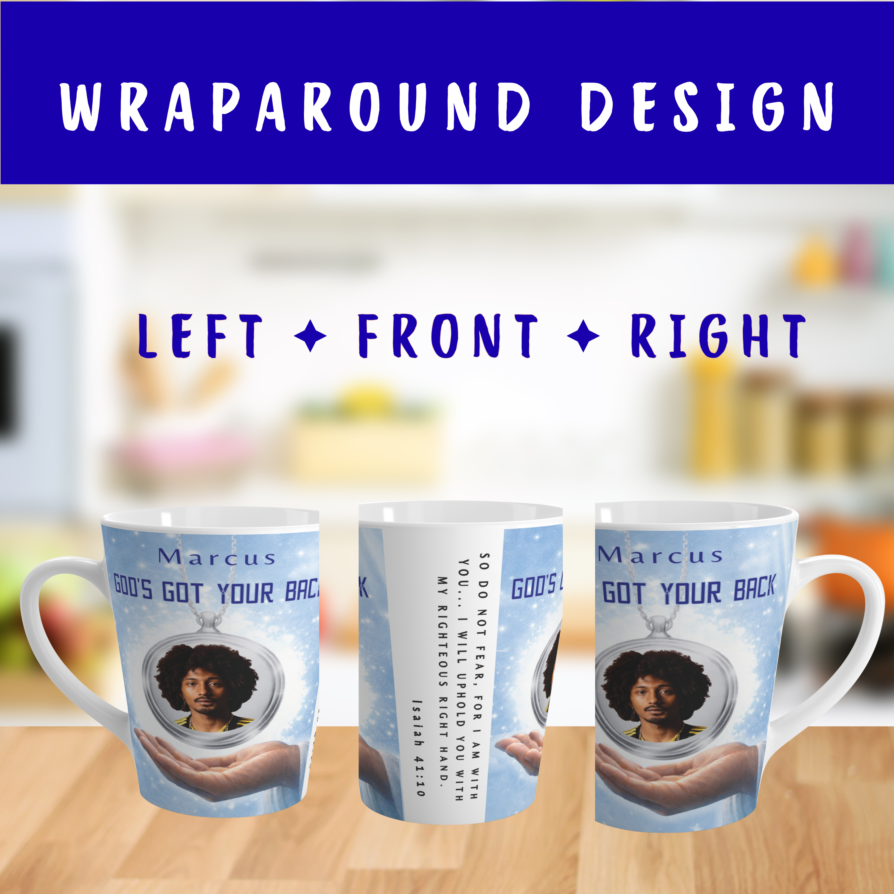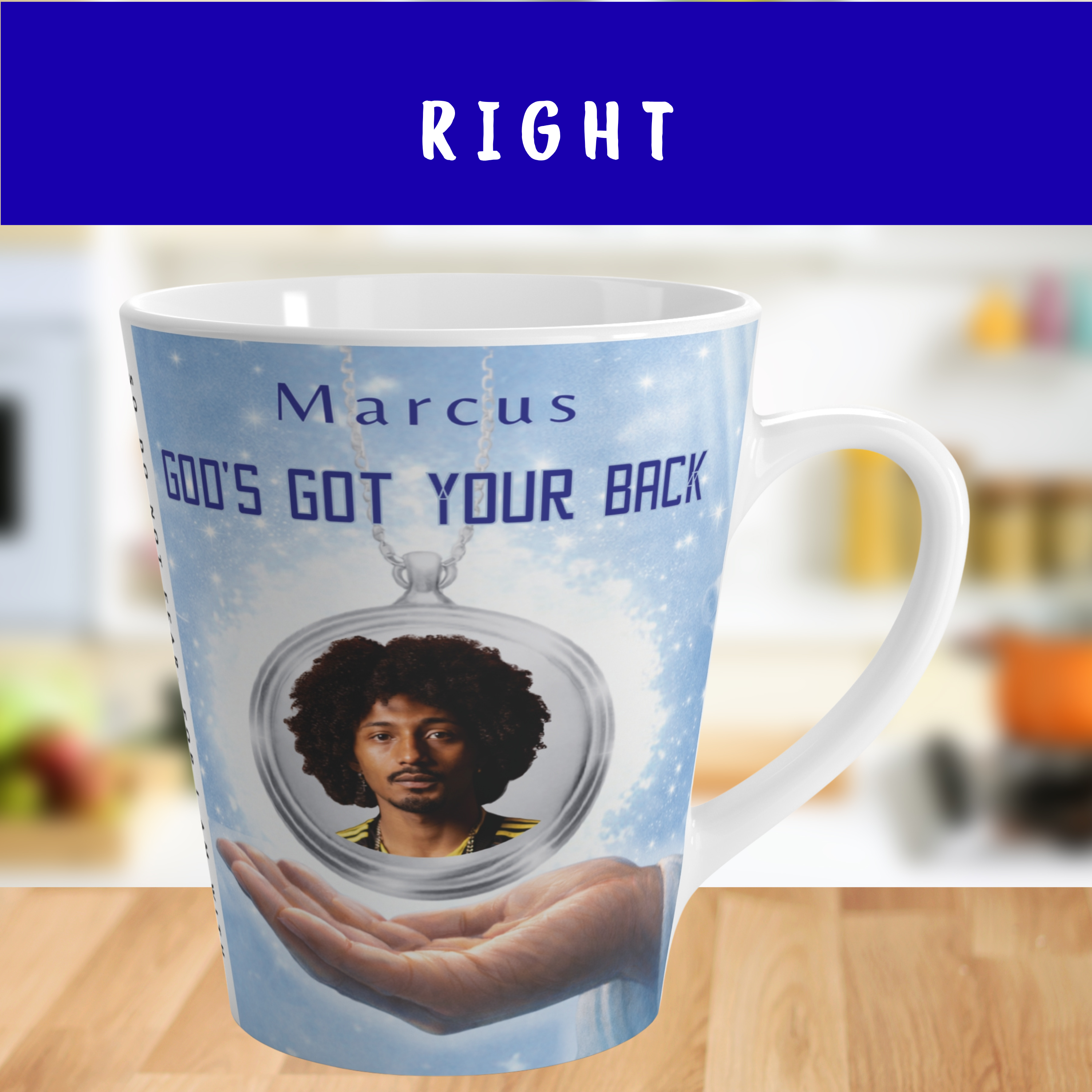 This beautifully designed 12 oz. “God’s Got Your Back” latte mug features a glowing photo locket that is safely falling onto God’s righteous right hand. The locket is paired with a portion of the inspiring message of faith found in bible verse Isaiah 41:10: