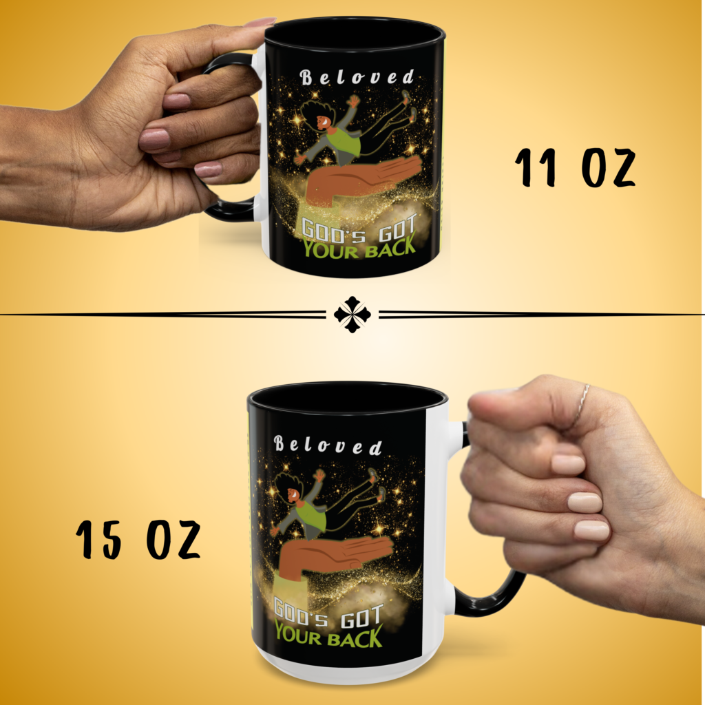 Start your day reminded of who’s holding you up—with this powerful “God’s Got Your Back” wraparound mug. Designed to encourage hearts and strengthen faith, this Christian mug features a joyful melanated woman falling safely onto God’s Righteous Right Hand, surrounded by shimmering gold stars and anchored by the promise of Isaiah 41:10: