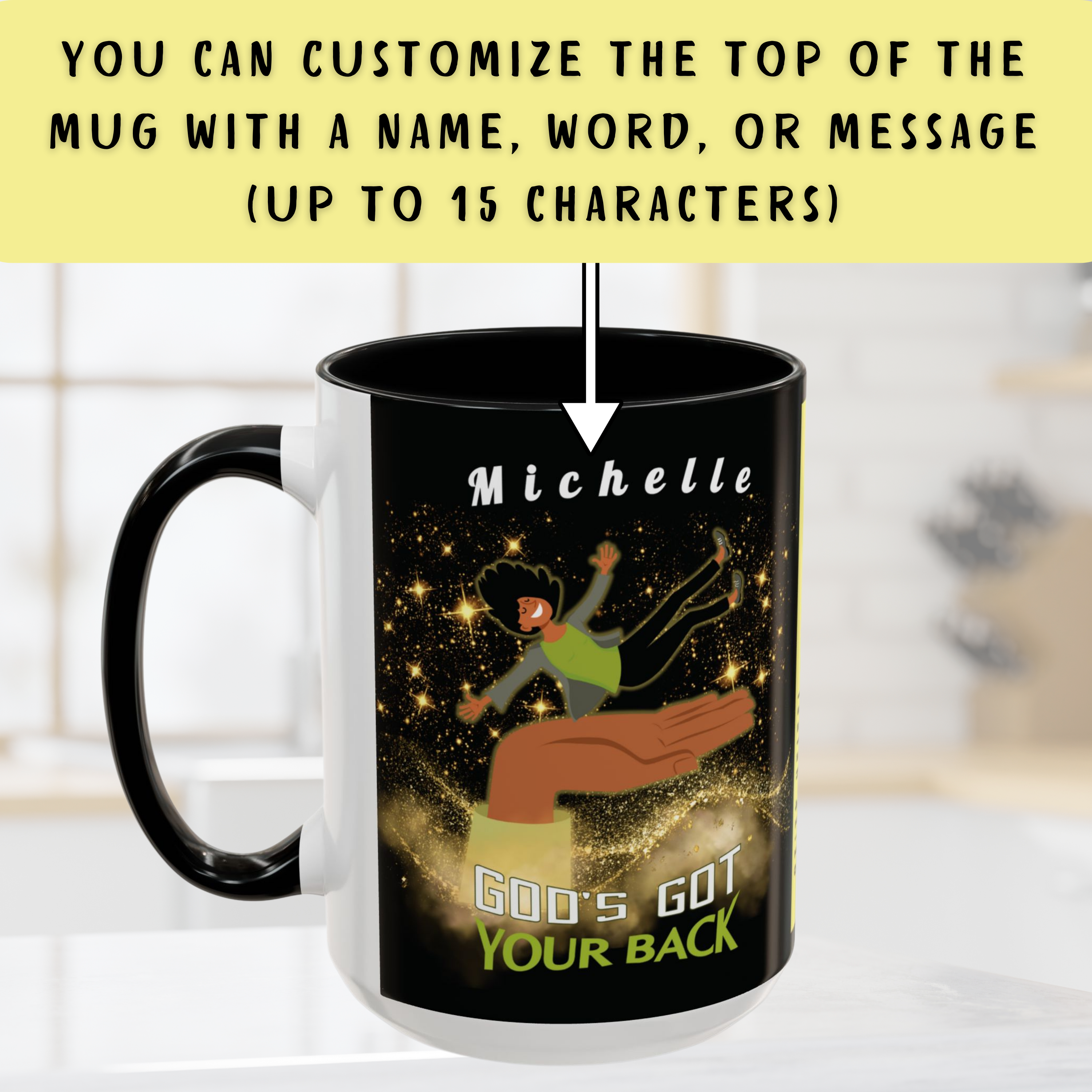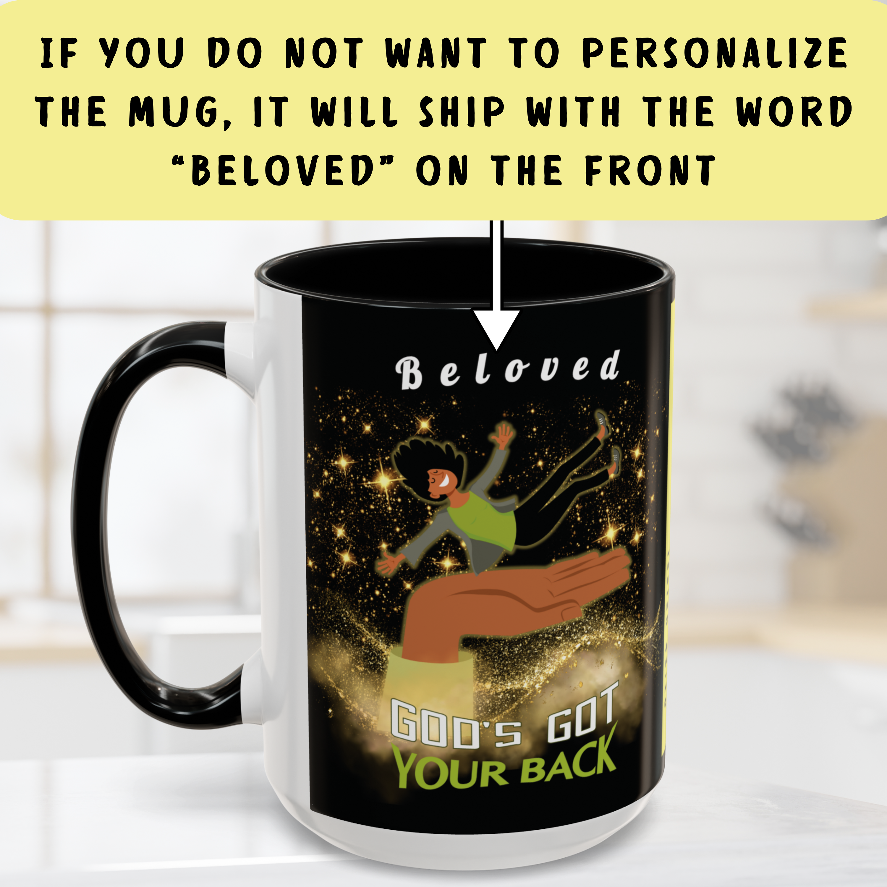 You can customize the top of the mug with a name, word, or message (up to 15 characters). If you do not choose to personalize it, the mug will ship with “Beloved” at the top.