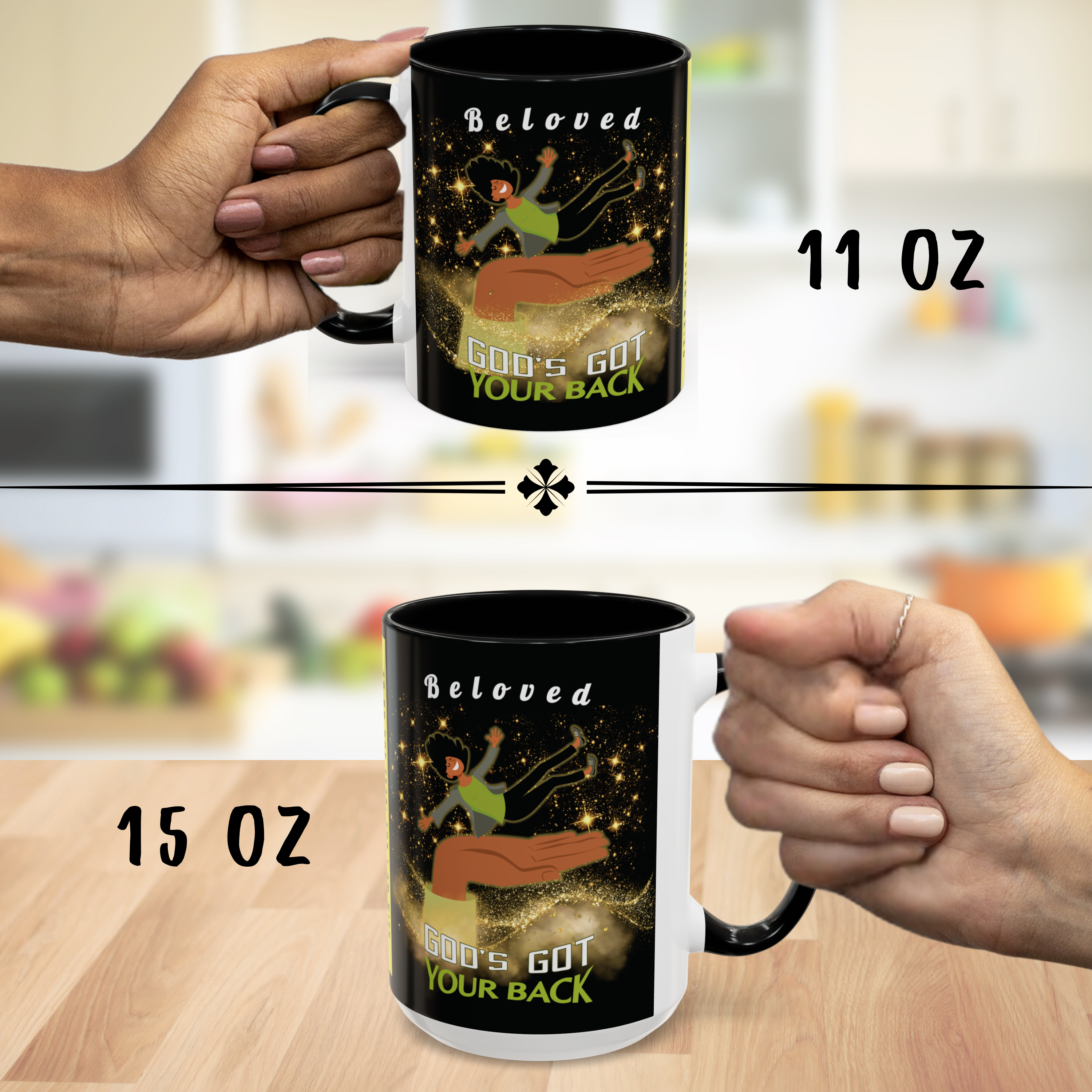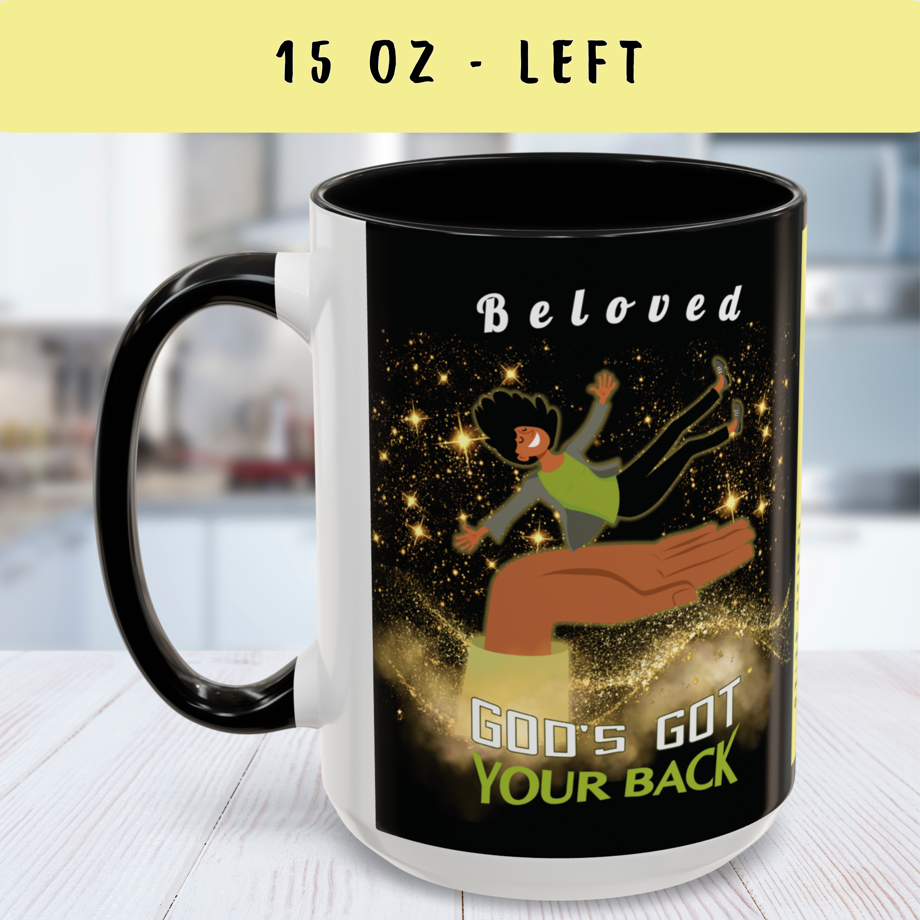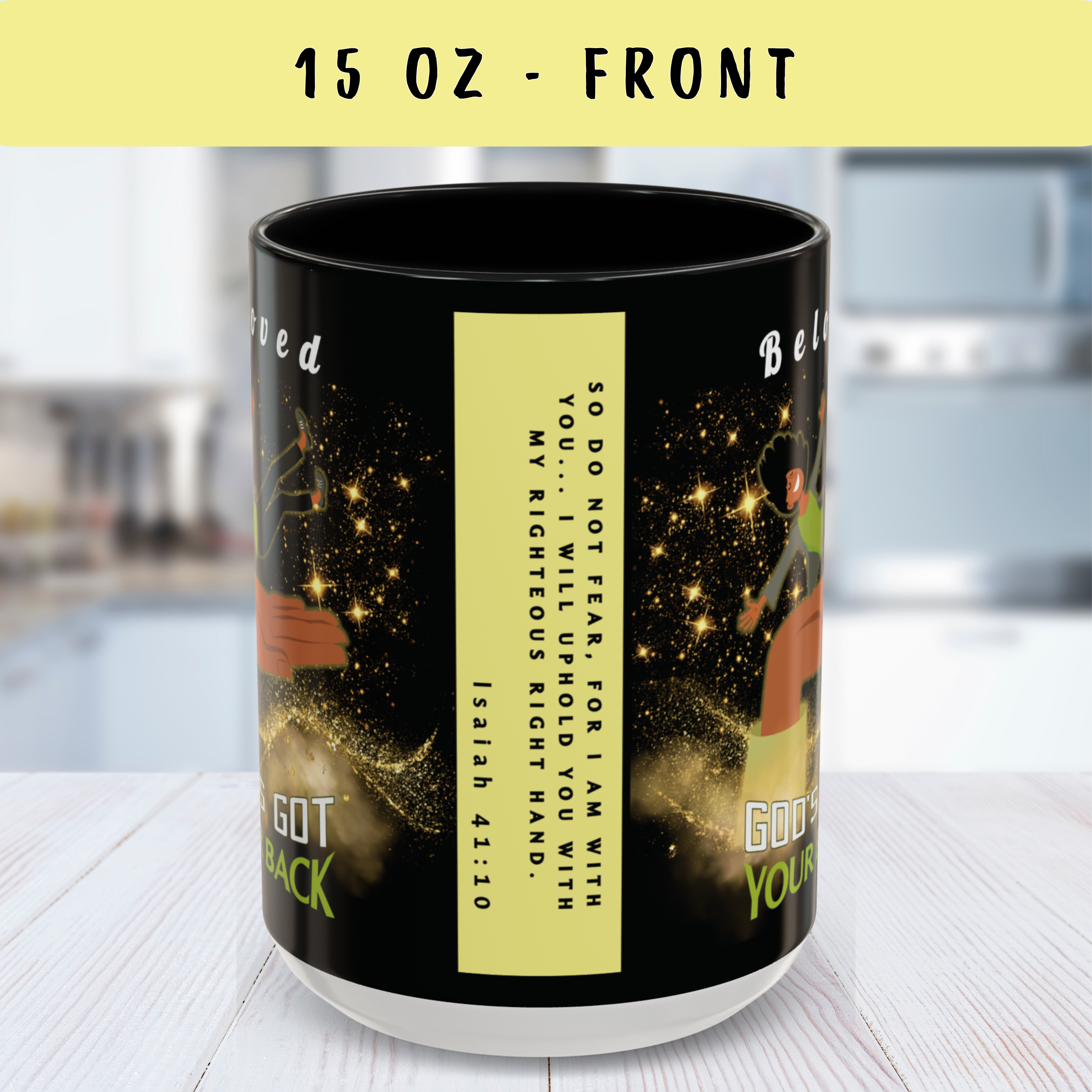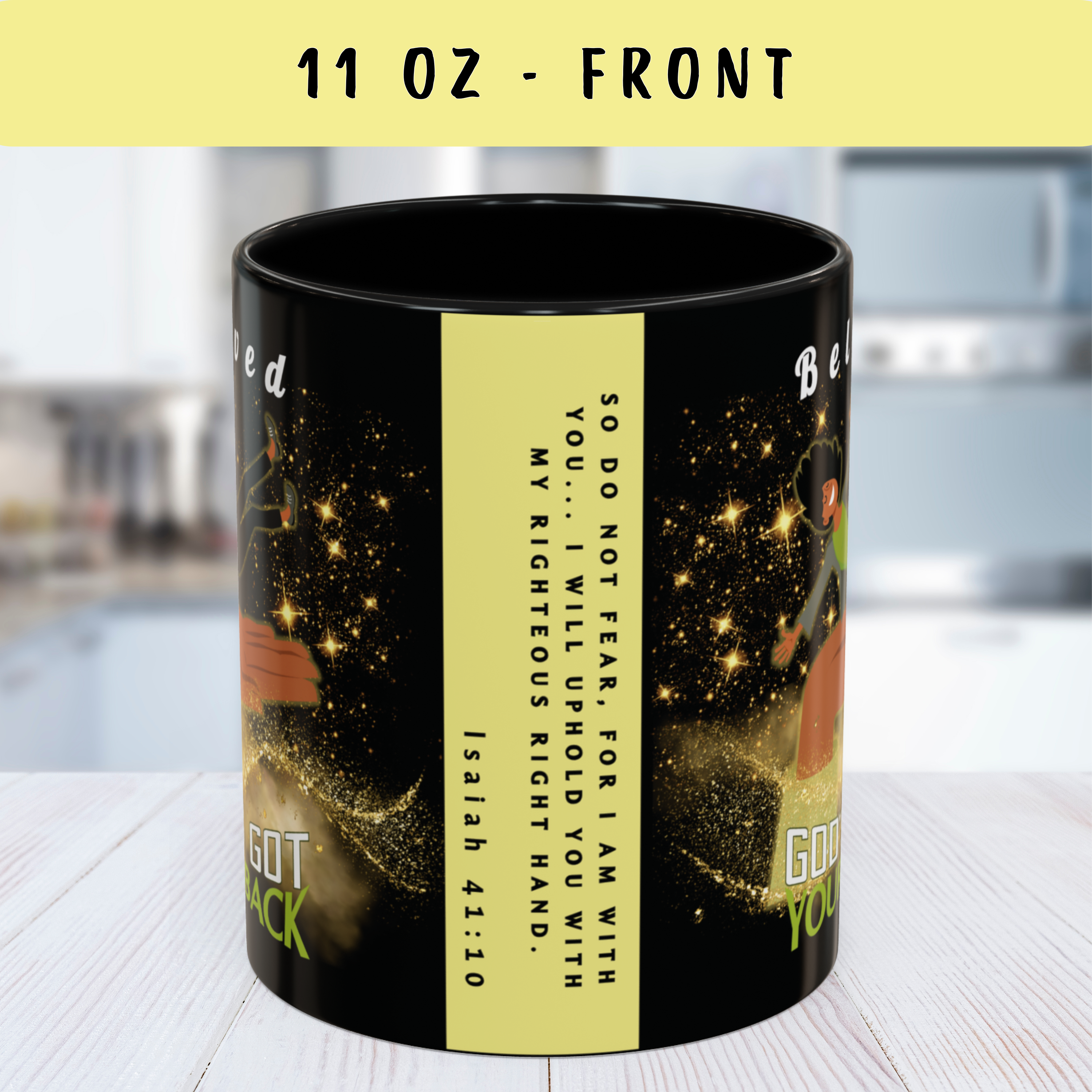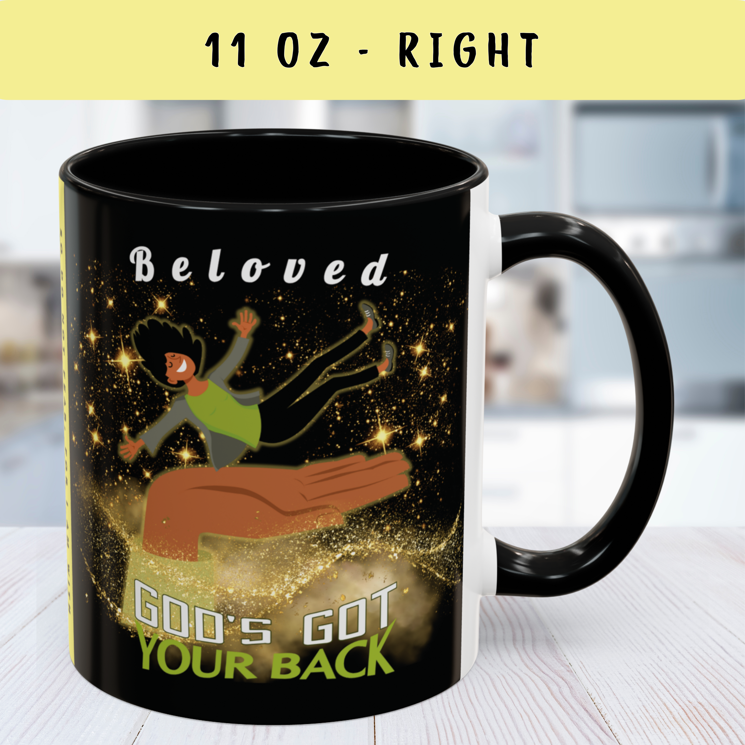 Start your day reminded of who’s holding you up—with this powerful “God’s Got Your Back” wraparound mug. Designed to encourage hearts and strengthen faith, this Christian mug features a joyful melanated woman falling safely onto God’s Righteous Right Hand, surrounded by shimmering gold stars and anchored by the promise of Isaiah 41:10: