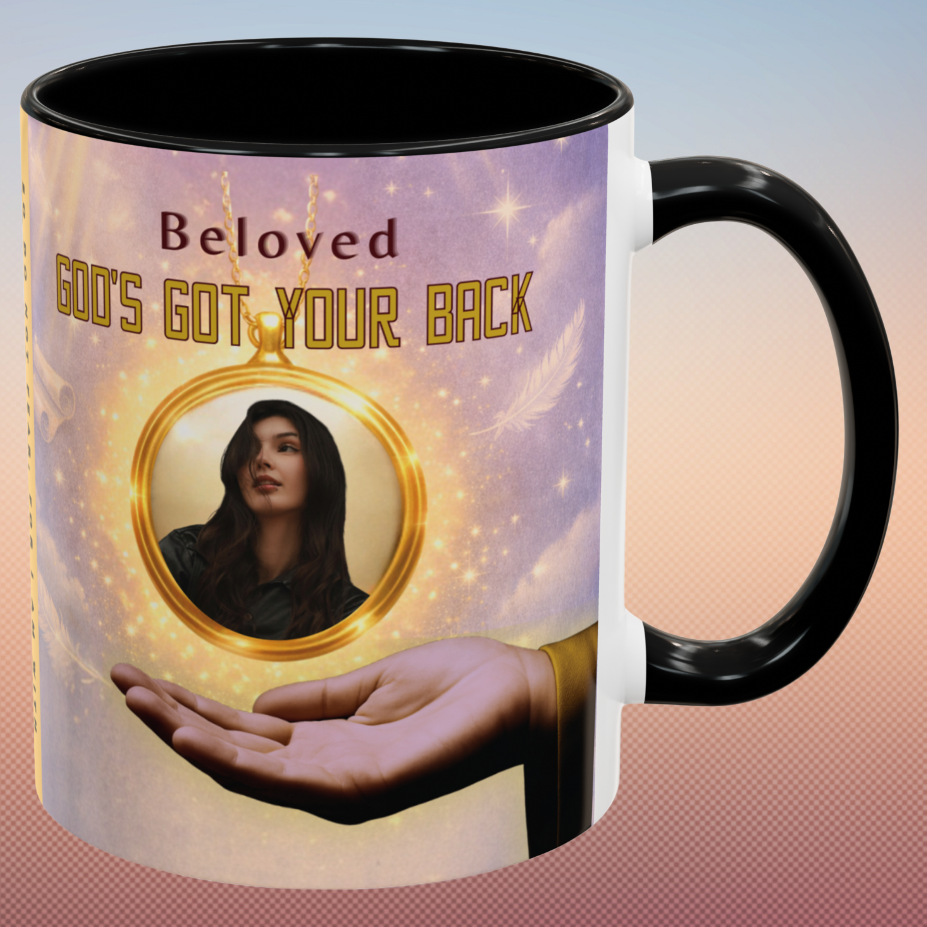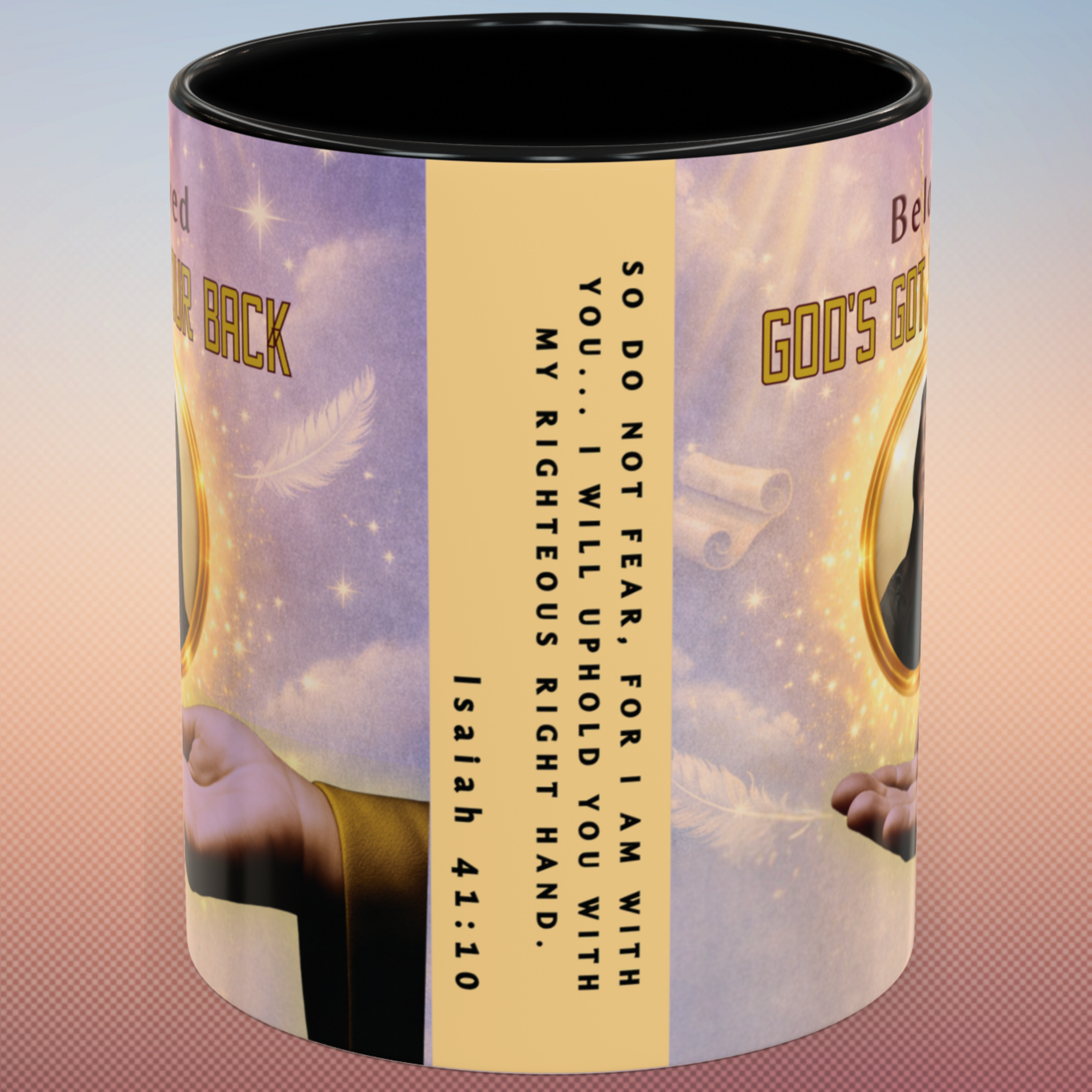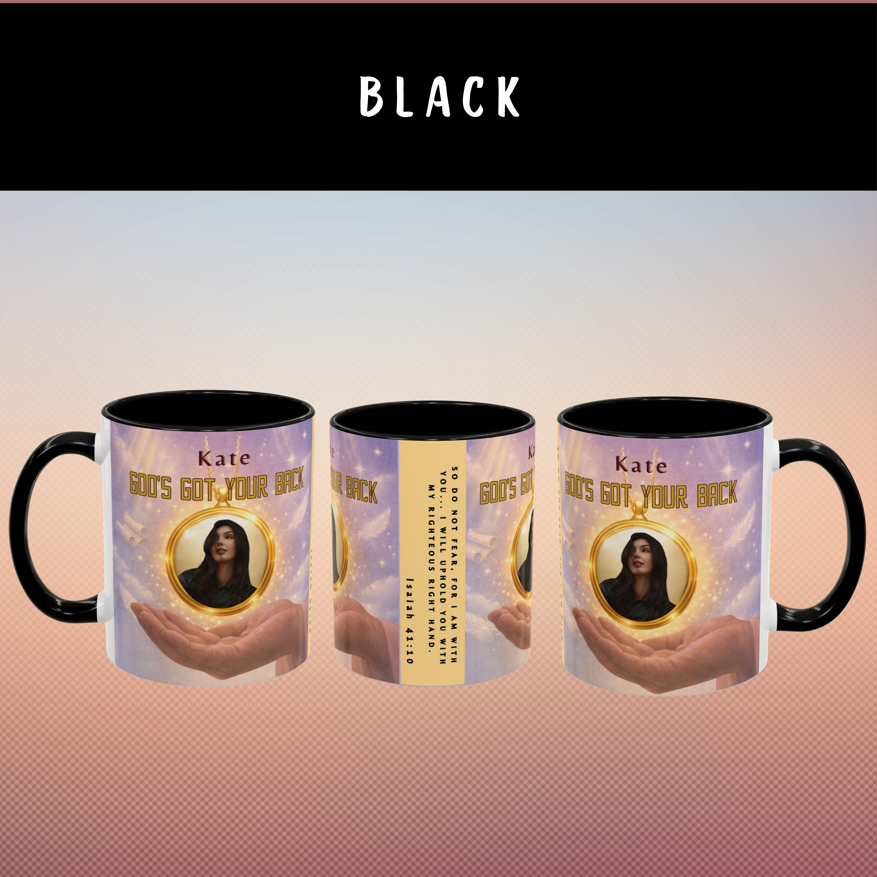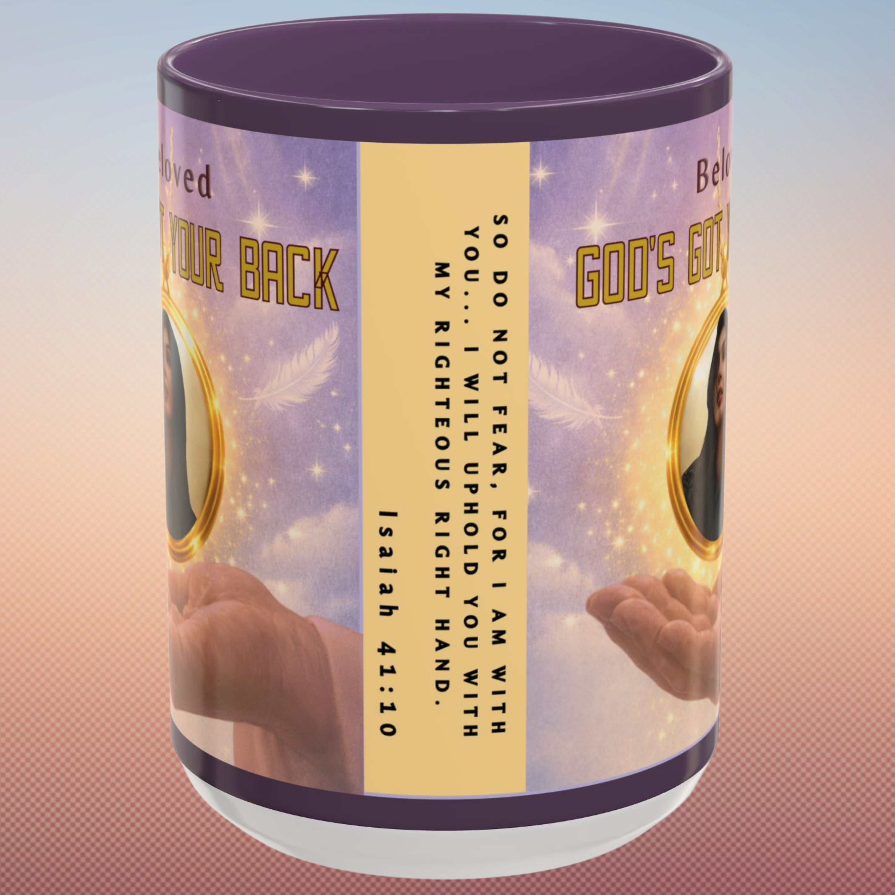 Start your day reminded of who’s holding you up—with this powerful “God’s Got Your Back” wraparound mug. Designed to encourage hearts and strengthen faith, this Christian mug features a golden photo locket falling safely onto God’s Righteous Right Hand, anchored by the promise of Isaiah 41:10: