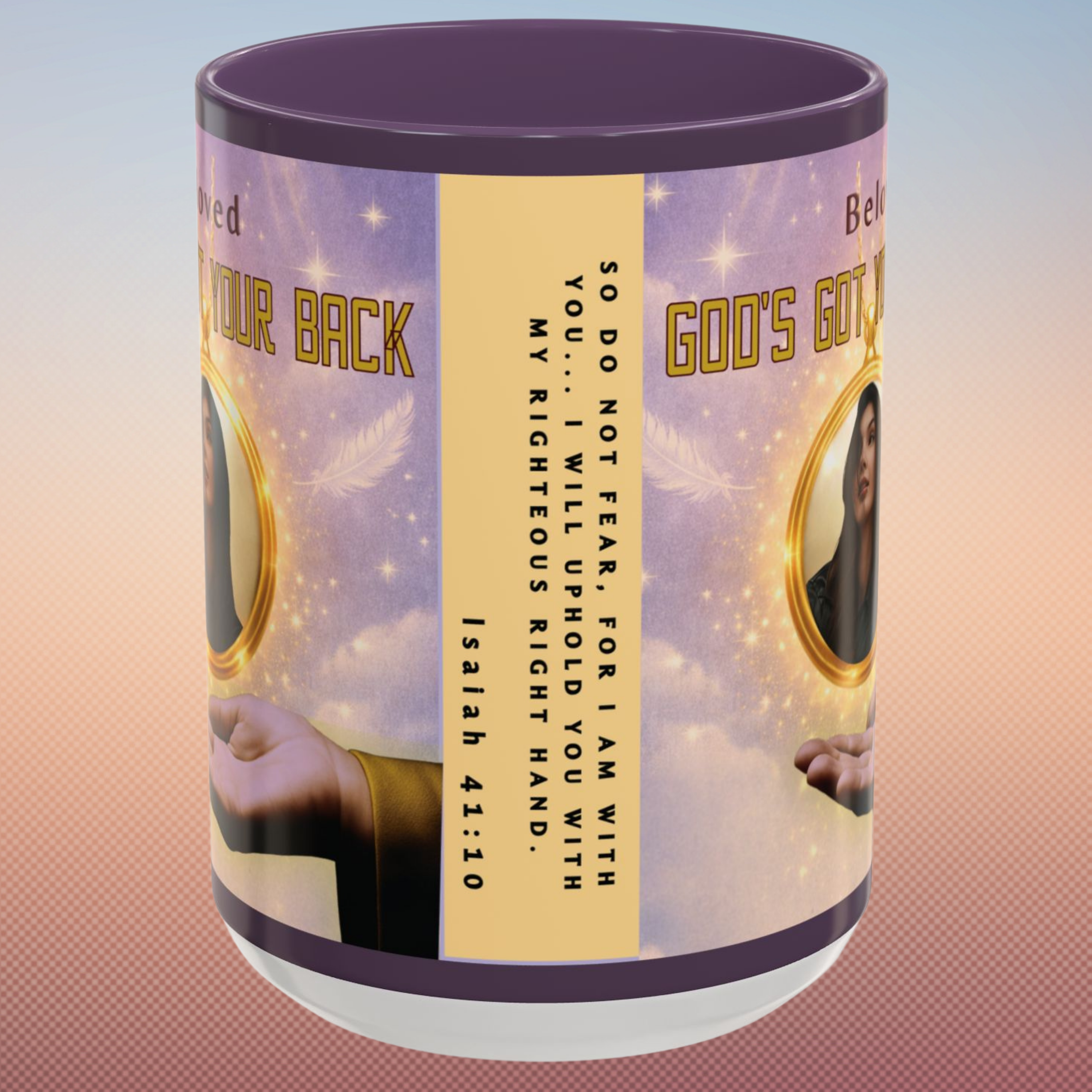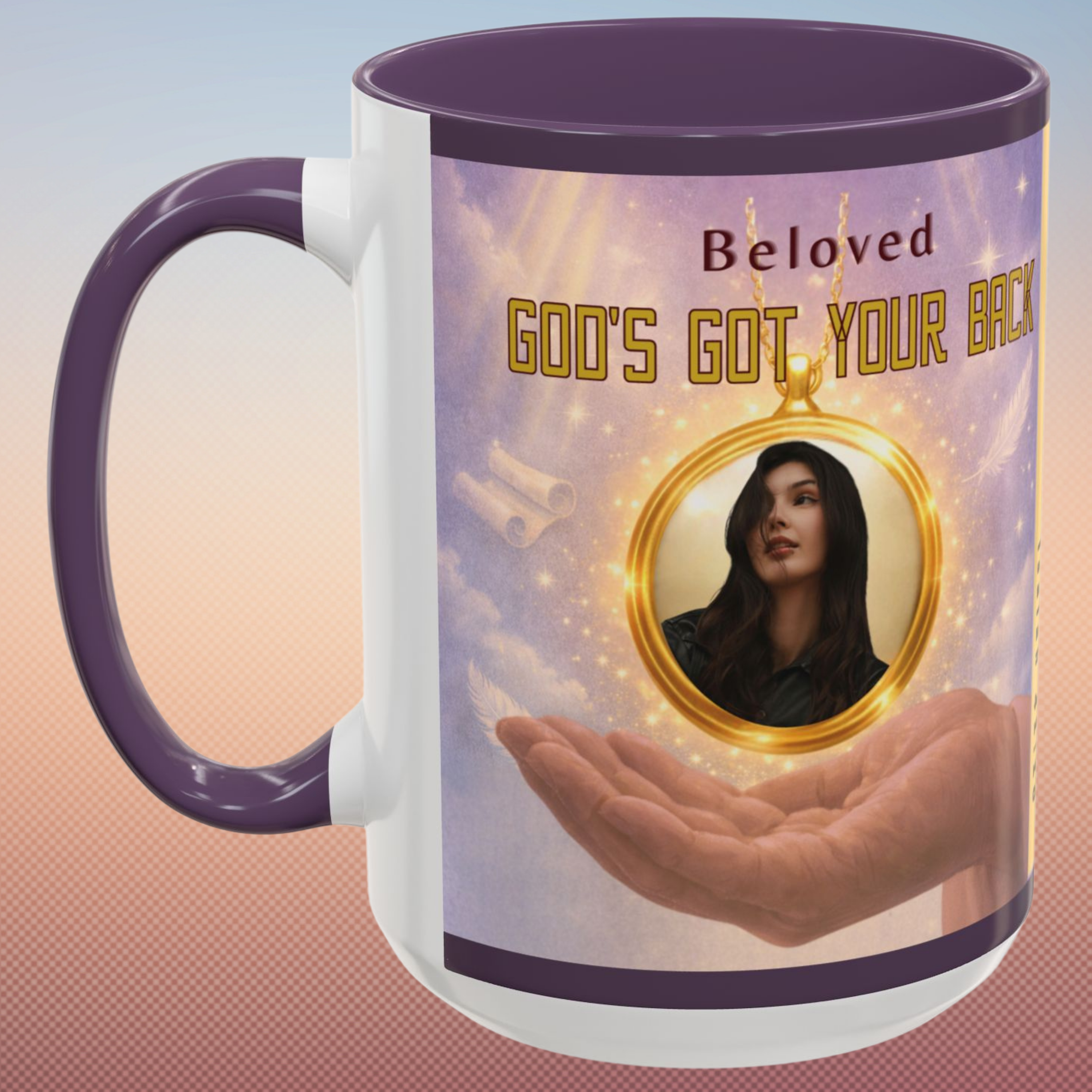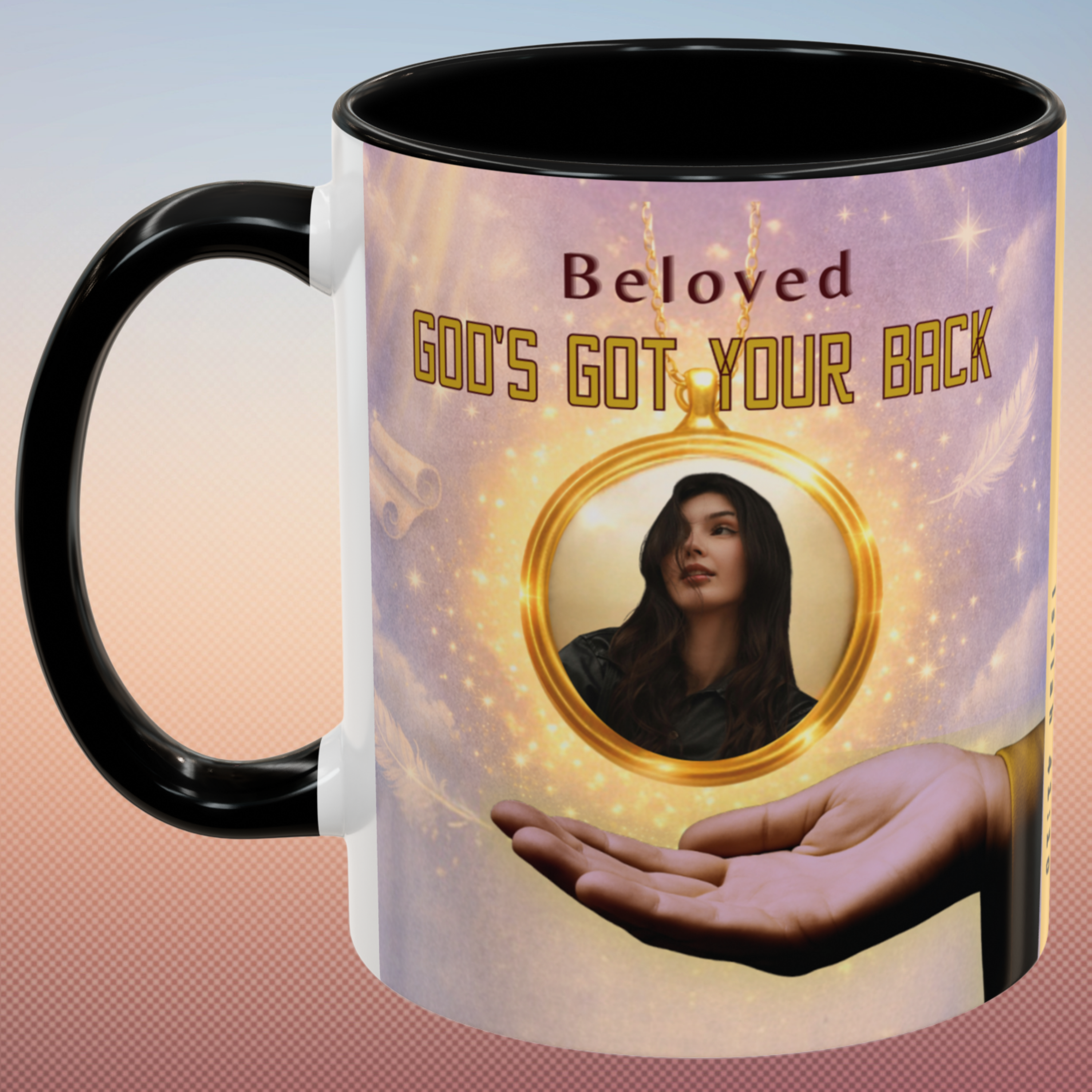 Start your day reminded of who’s holding you up—with this powerful “God’s Got Your Back” wraparound mug. Designed to encourage hearts and strengthen faith, this Christian mug features a golden photo locket falling safely onto God’s Righteous Right Hand, anchored by the promise of Isaiah 41:10: