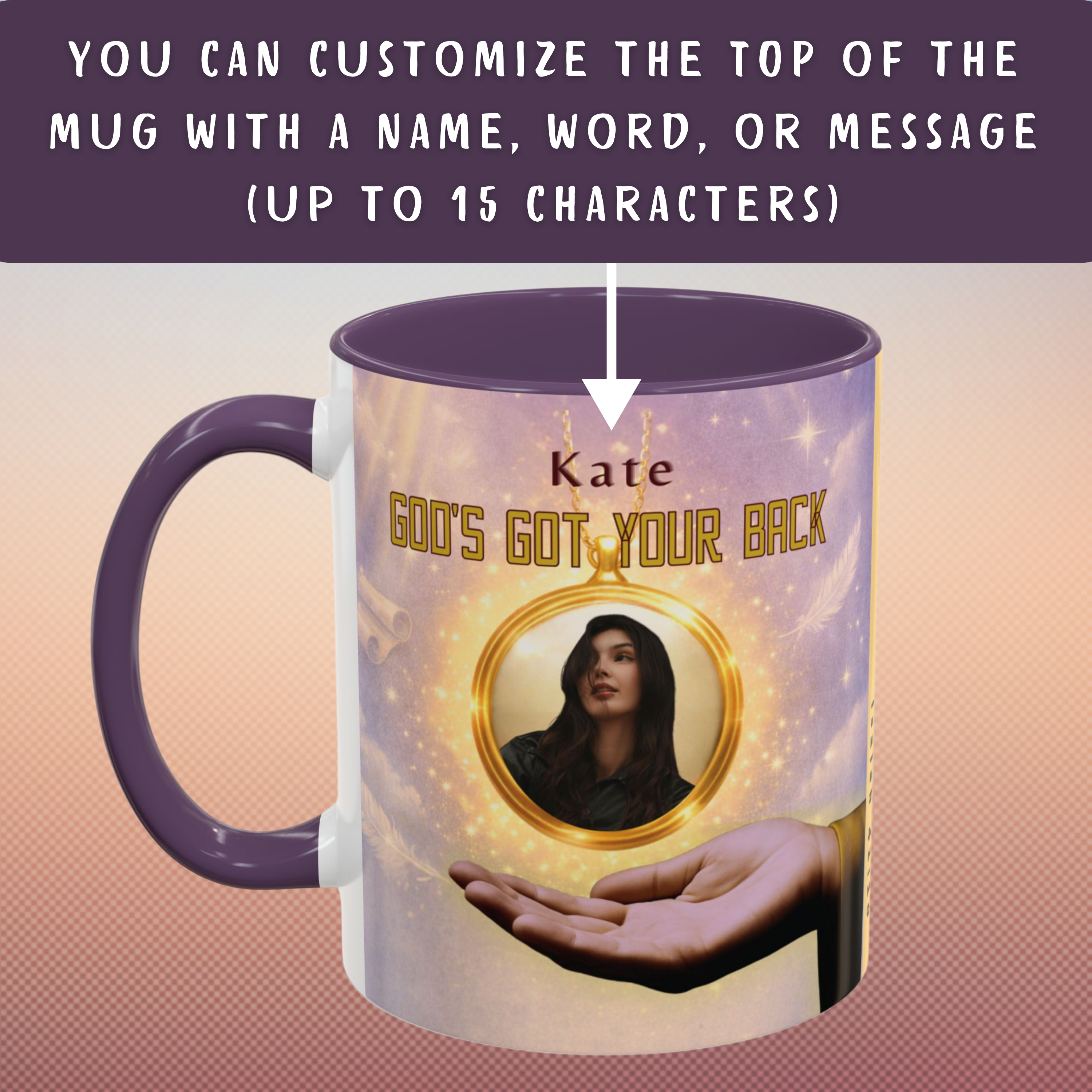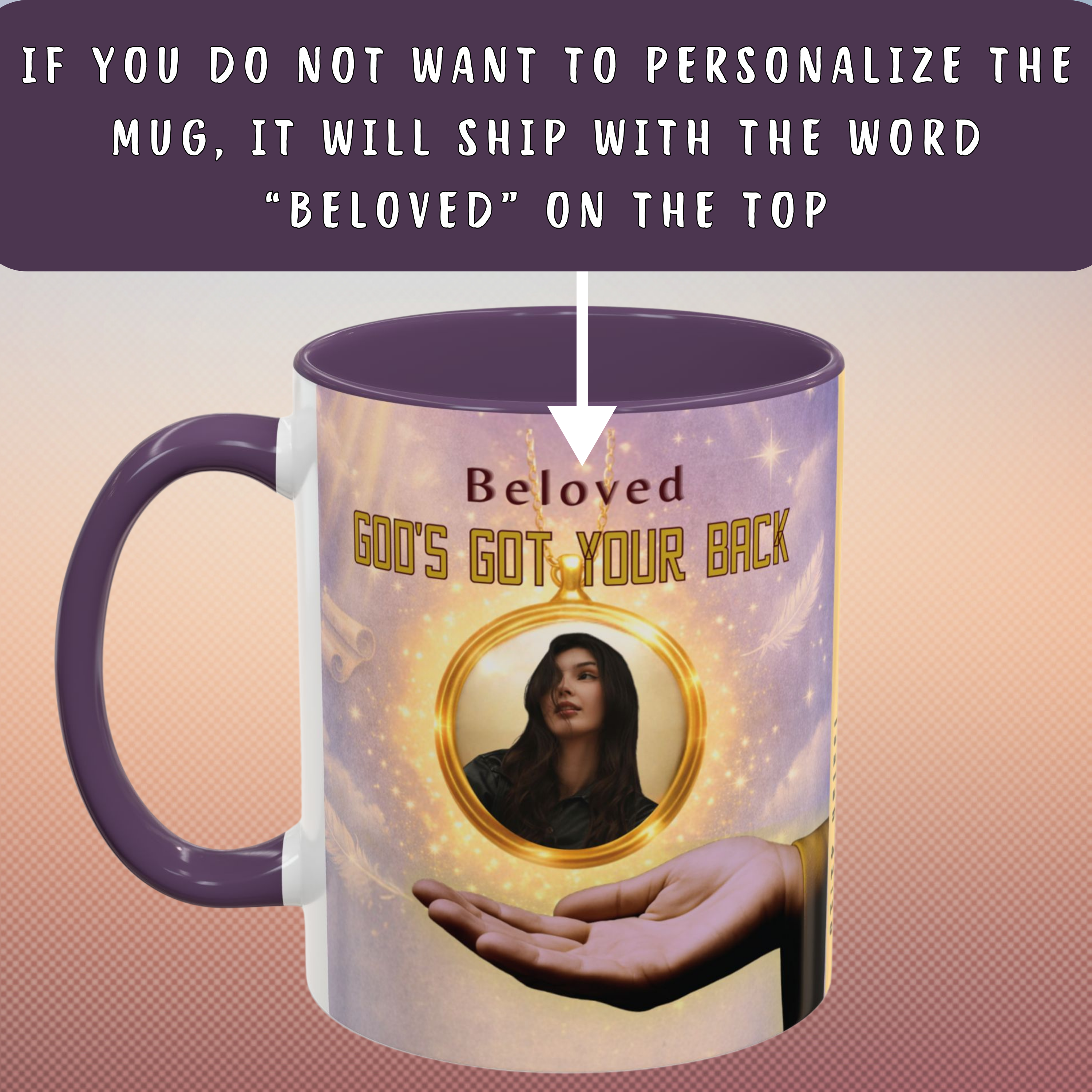 Step 1: You can customize the top of the mug with a name, word, or message (up to 15 characters). If you do not personalize it, the mug will ship with “Beloved” at the top.