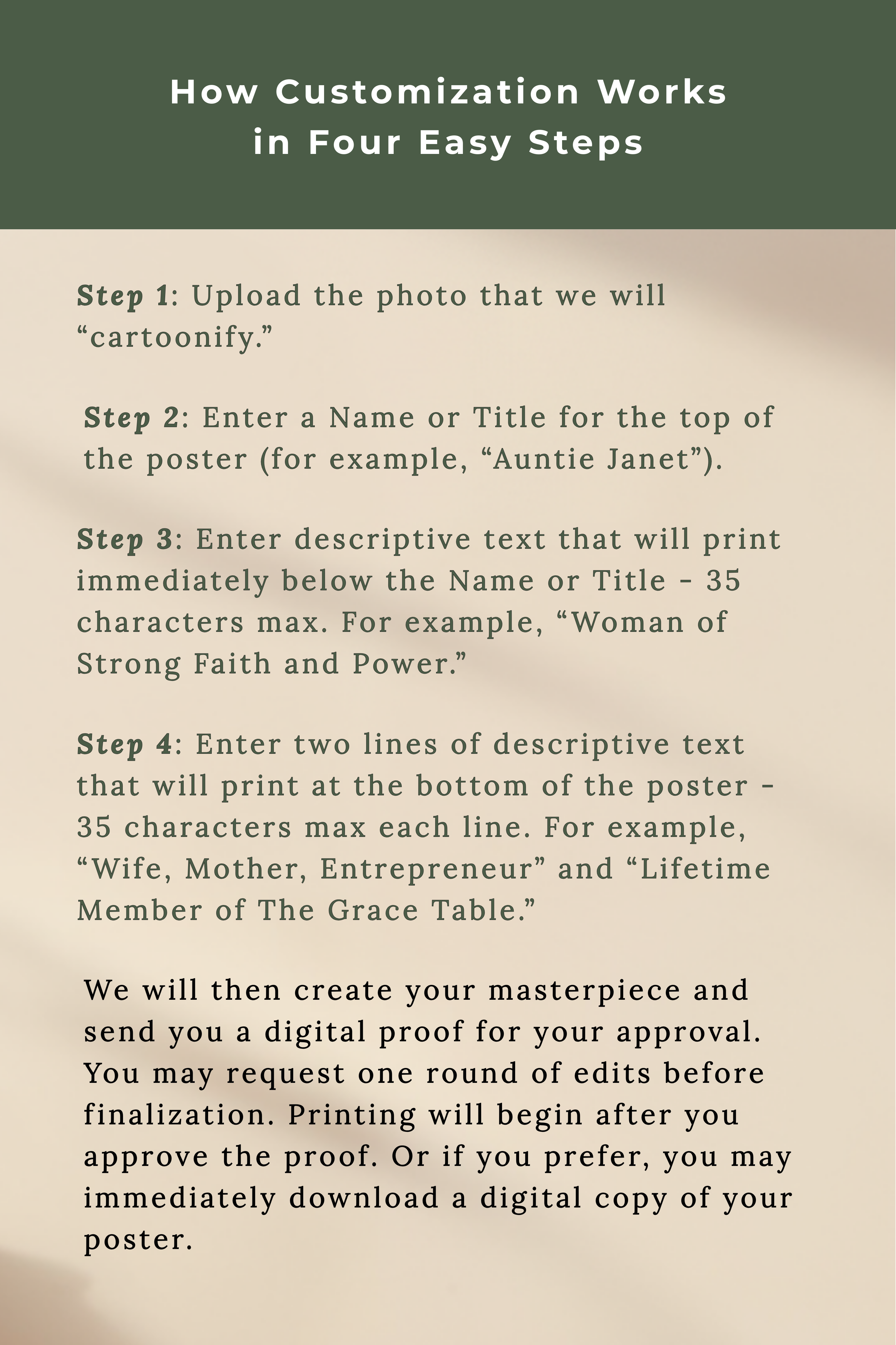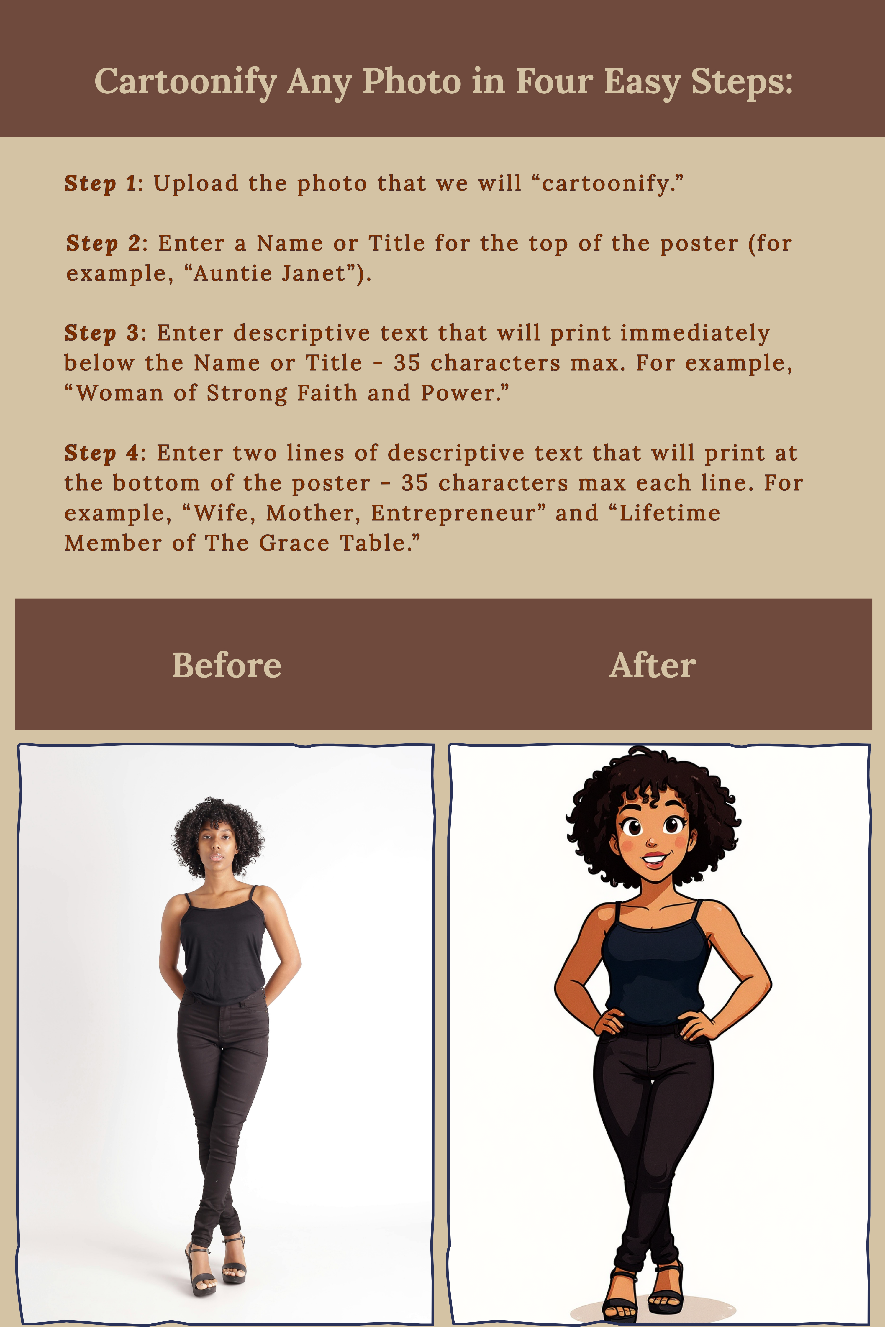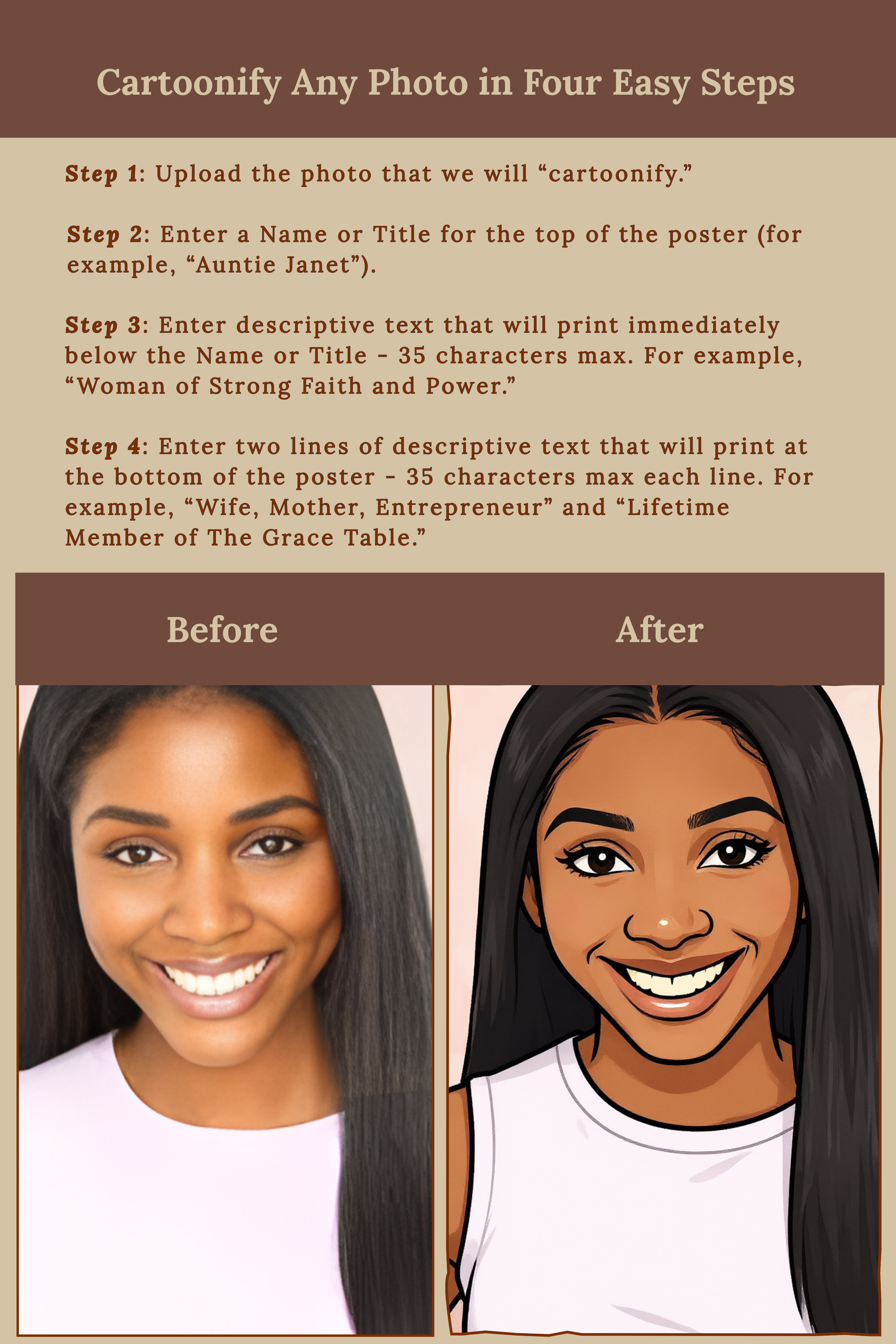 - Enter two lines of descriptive text that will print at the bottom of the poster – 35 characters max each line. For example, “Wife, Mother, Entrepreneur” and “Lifetime Diner At The Grace Table.”