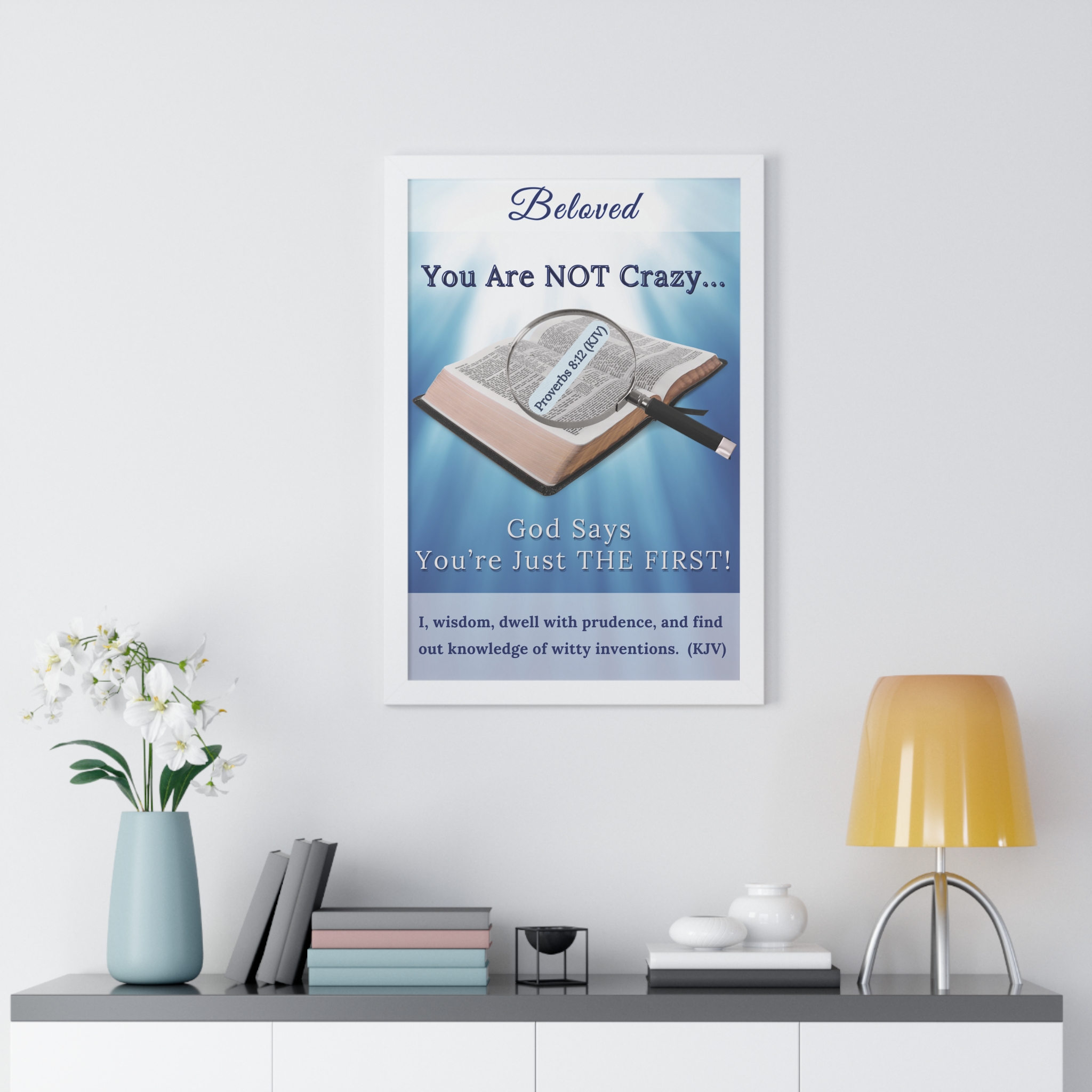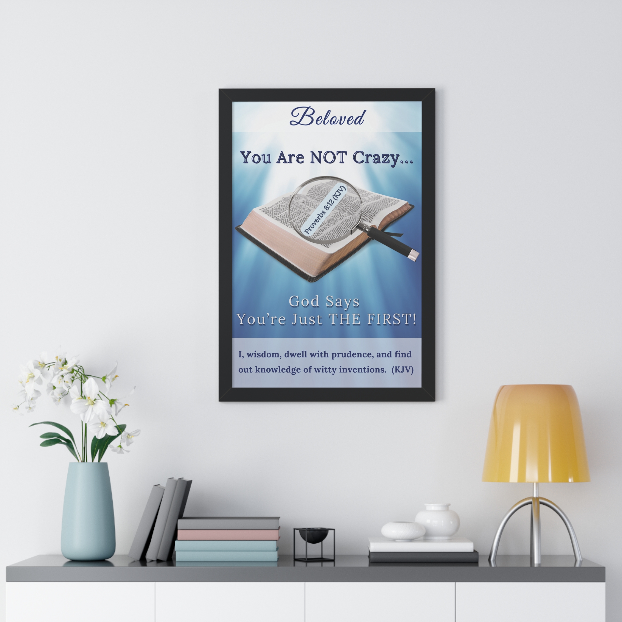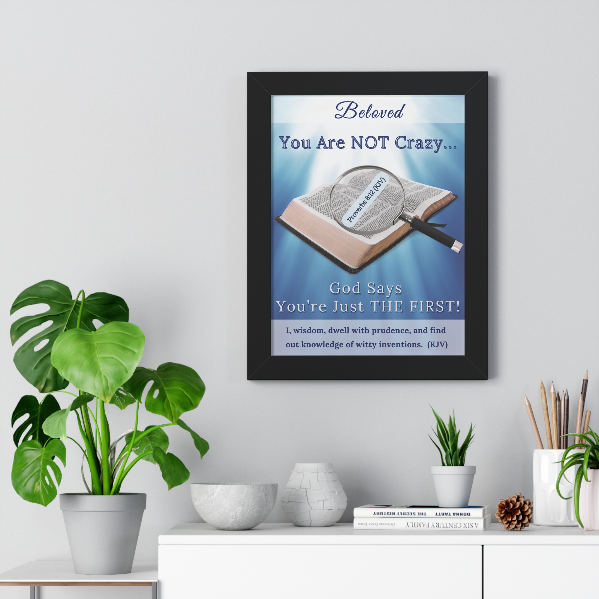 VERTICAL FRAMED POSTER: Personalizable “You Are NOT Crazy – God Says You’re Just THE FIRST” Poster | Proverbs 8:12 Wall Art | Christian Faith Gift for Entrepreneurs