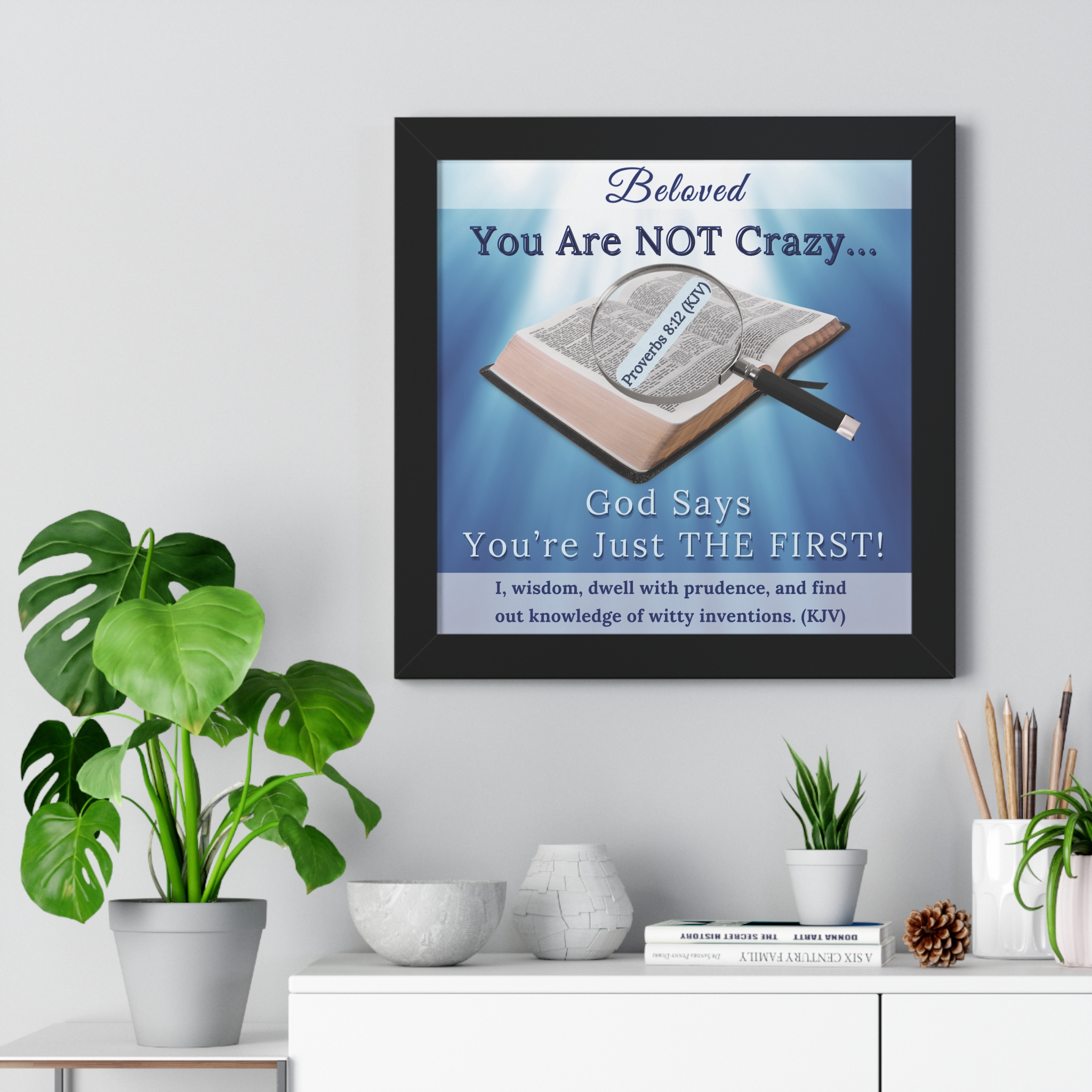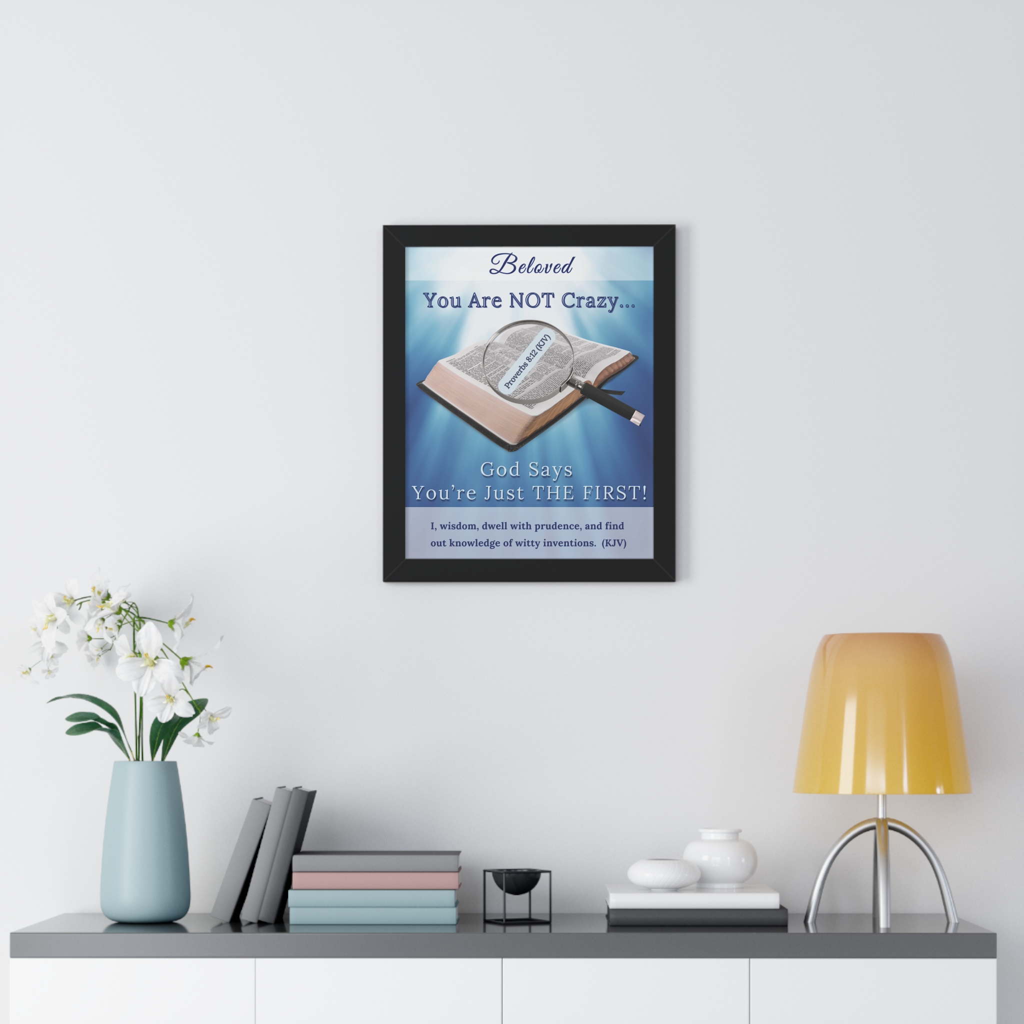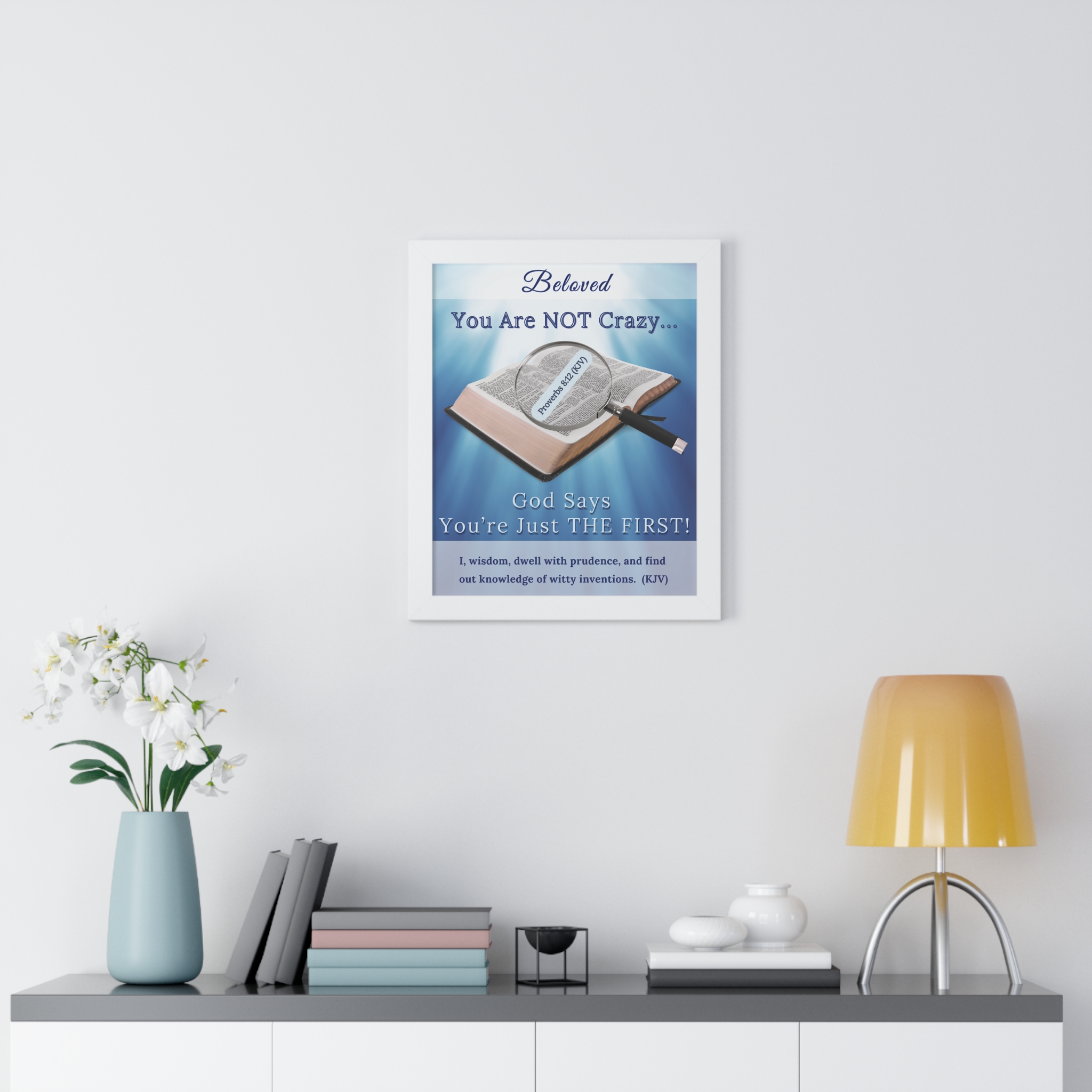VERTICAL FRAMED POSTER: Personalizable “You Are NOT Crazy – God Says You’re Just THE FIRST” Poster | Proverbs 8:12 Wall Art | Christian Faith Gift for Entrepreneurs