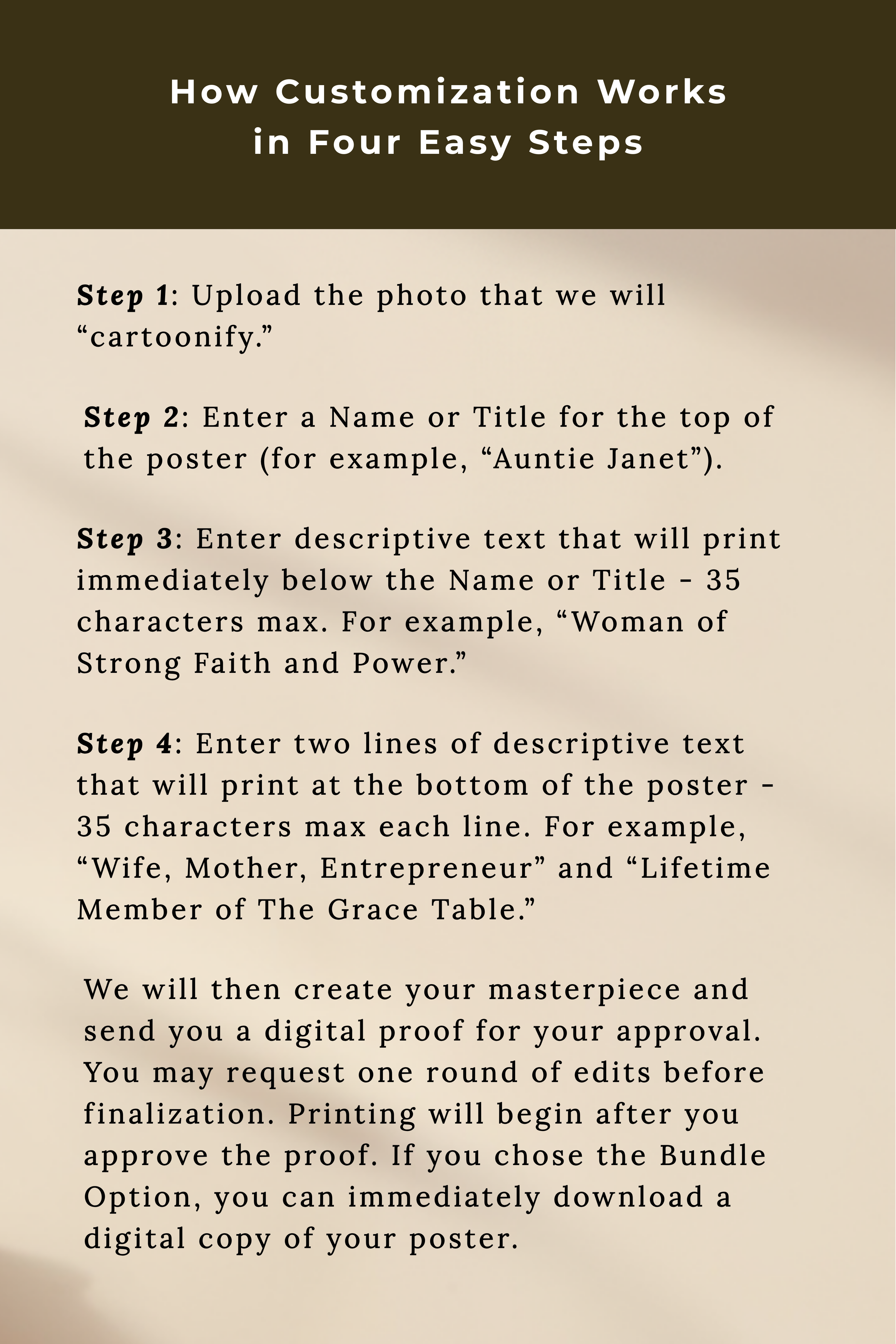 - As soon as we receive the final approval of your cartoonified poster, we will immediately send you two high-resolution digital files (one PDF file and one PNG file, both 300 DPI) delivered via email or a download link.