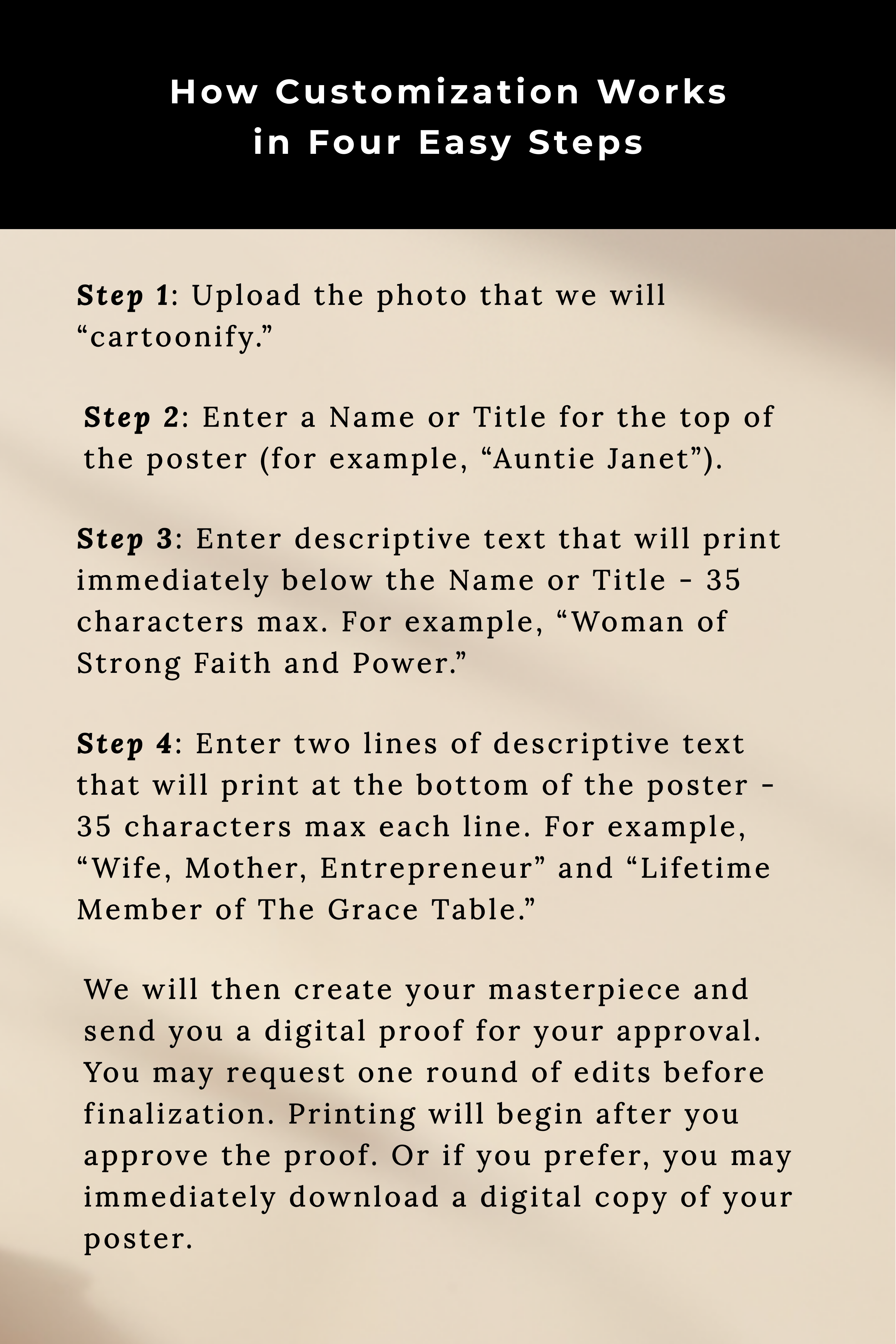 - Enter two lines of descriptive text that will print at the bottom of the poster – 35 characters max each line – for example, “Wife, Mother, Entrepreneur” and “Lifetime Diner At The Grace Table.”