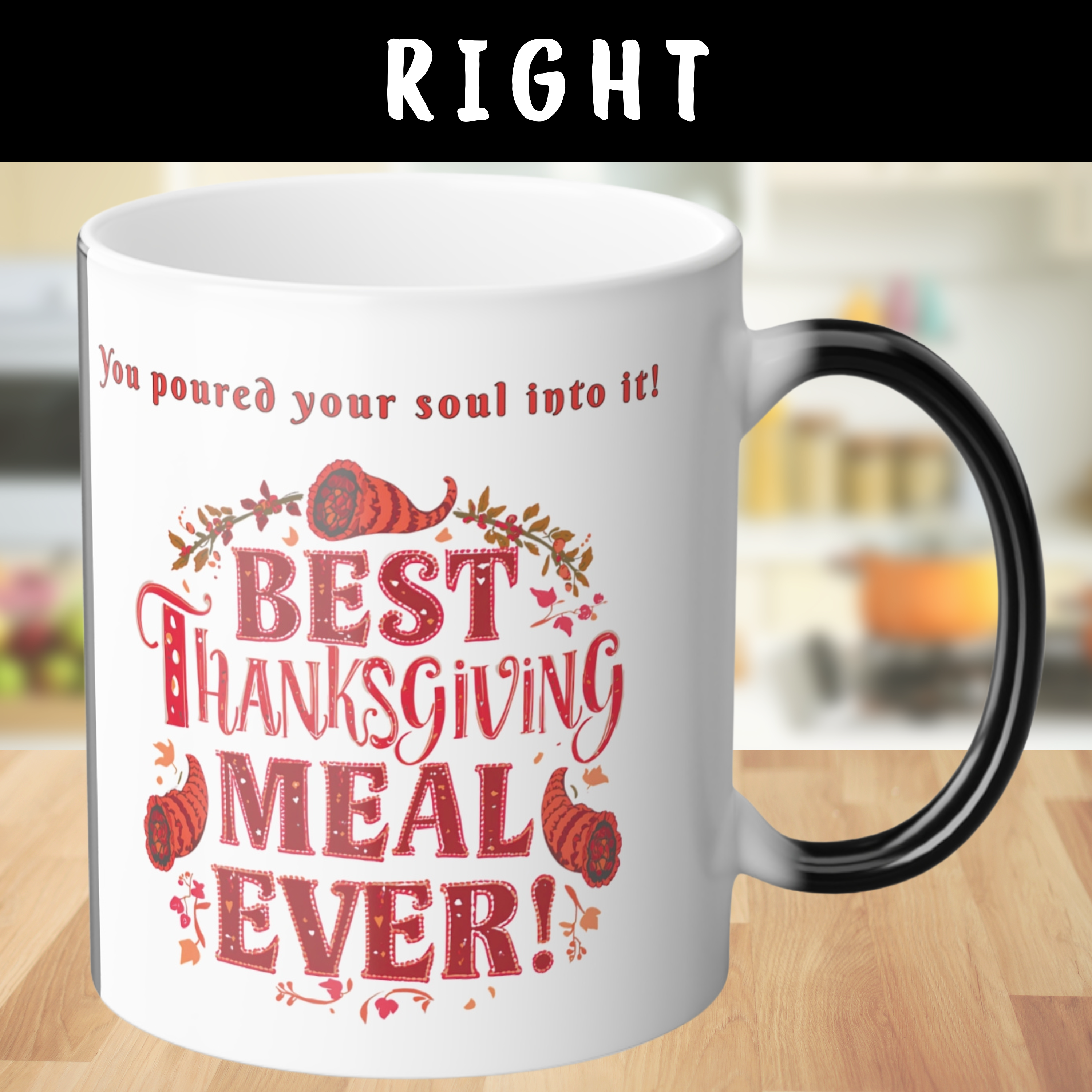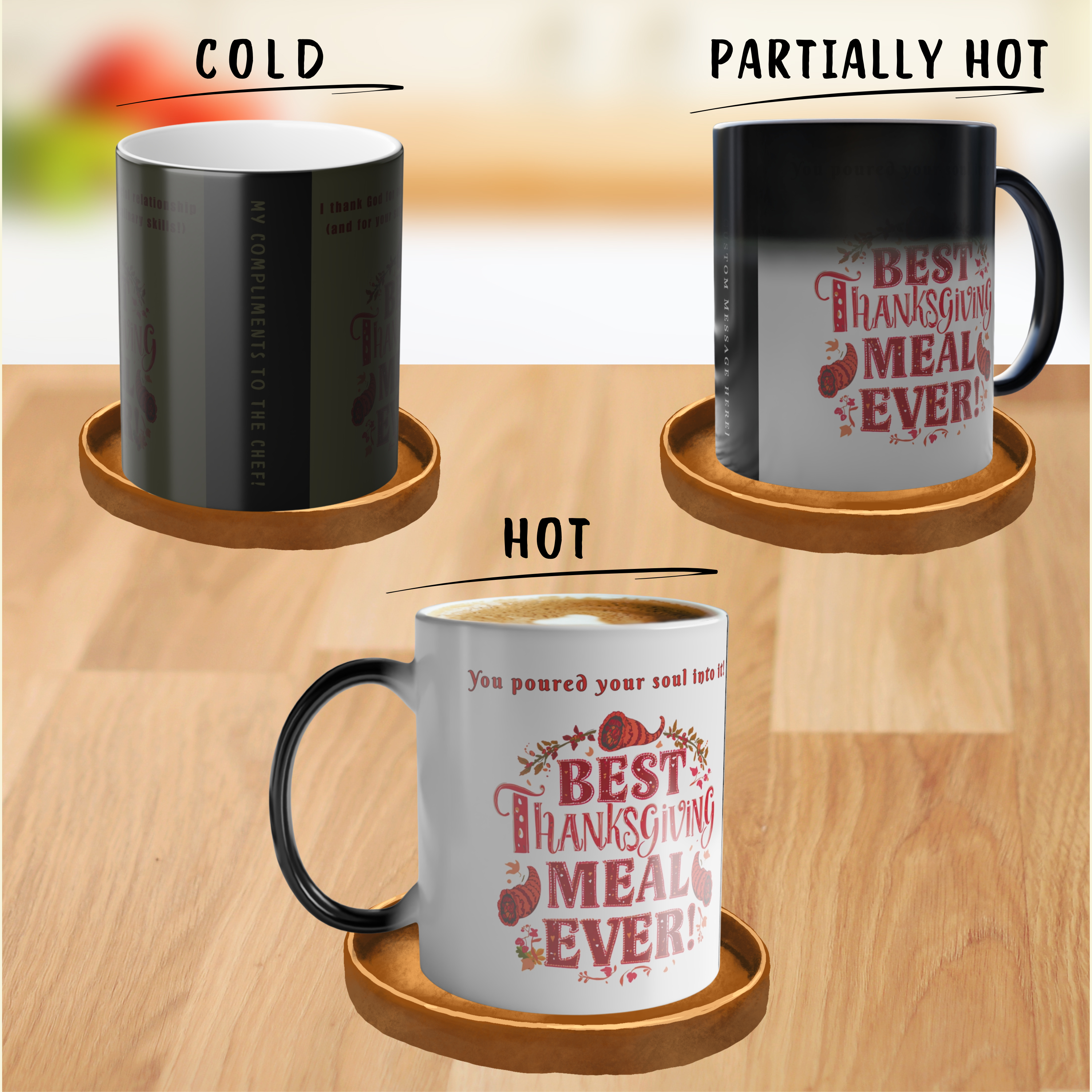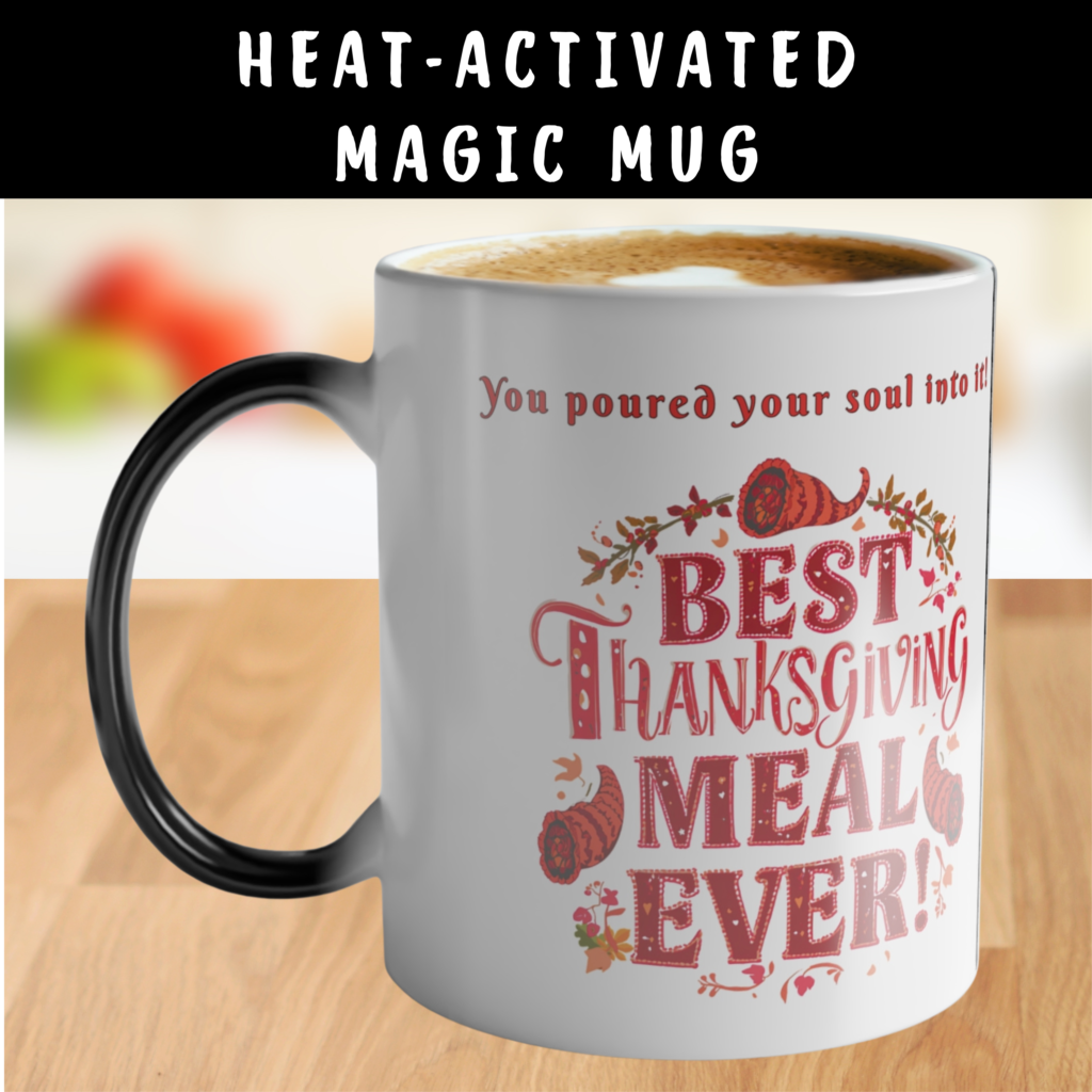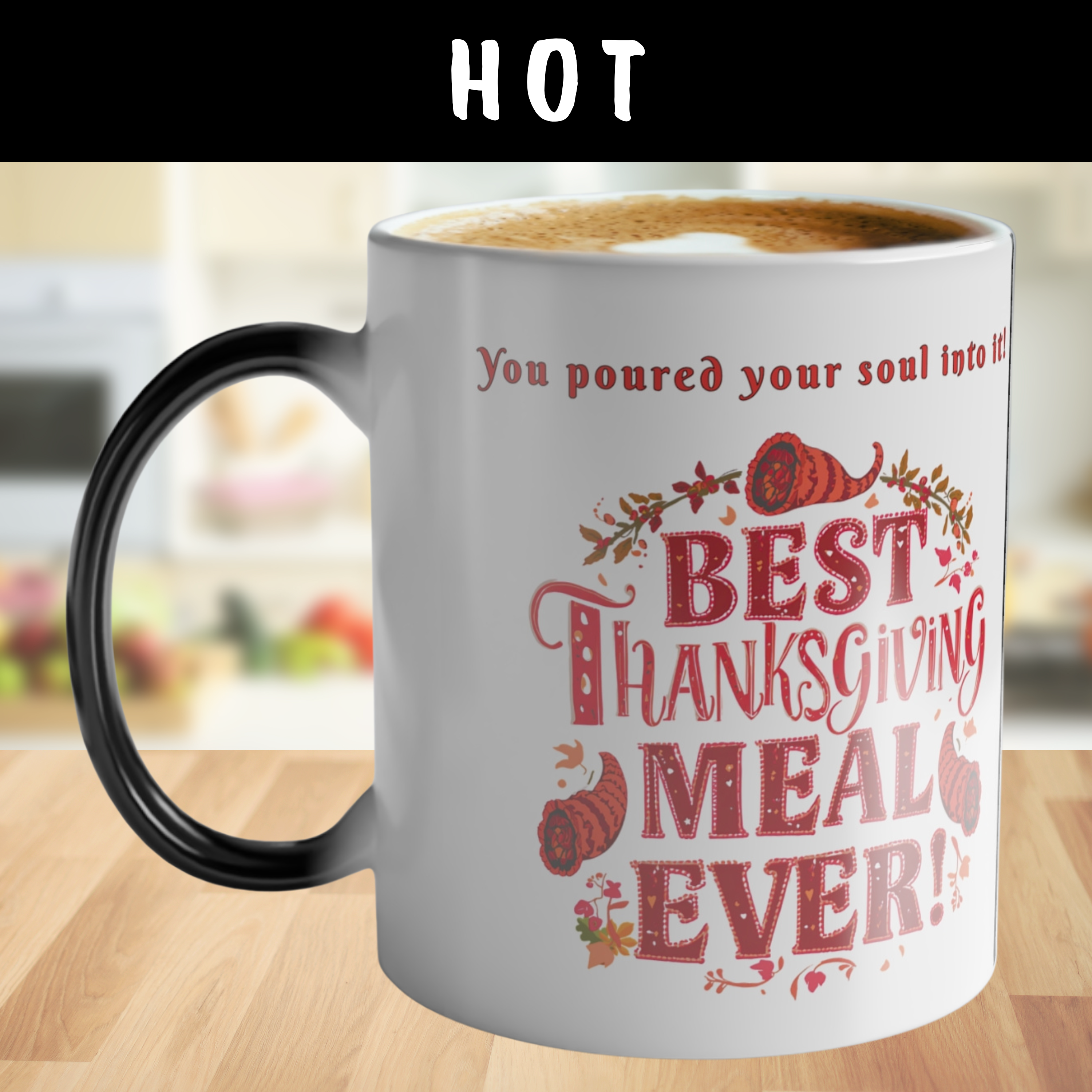 Celebrate gratitude with every sip. This personalized, color-changing, white-background Thanksgiving mug is perfect for showing appreciation to your favorite chef or host. When hot liquid is poured in, the black exterior transforms to reveal a joyful “You Poured Your Soul Into It – Best Thanksgiving Meal Ever!” design surrounded by fall motifs.