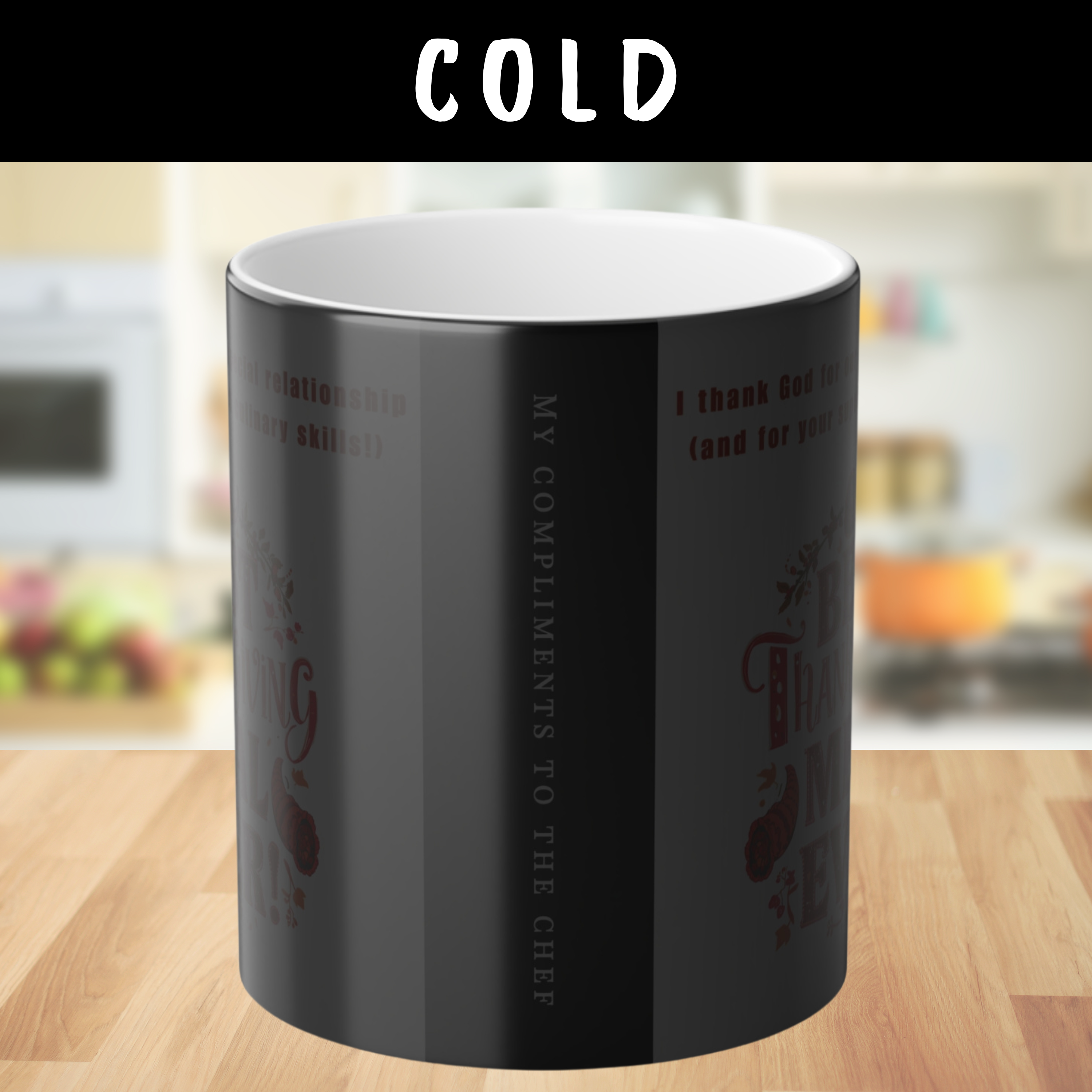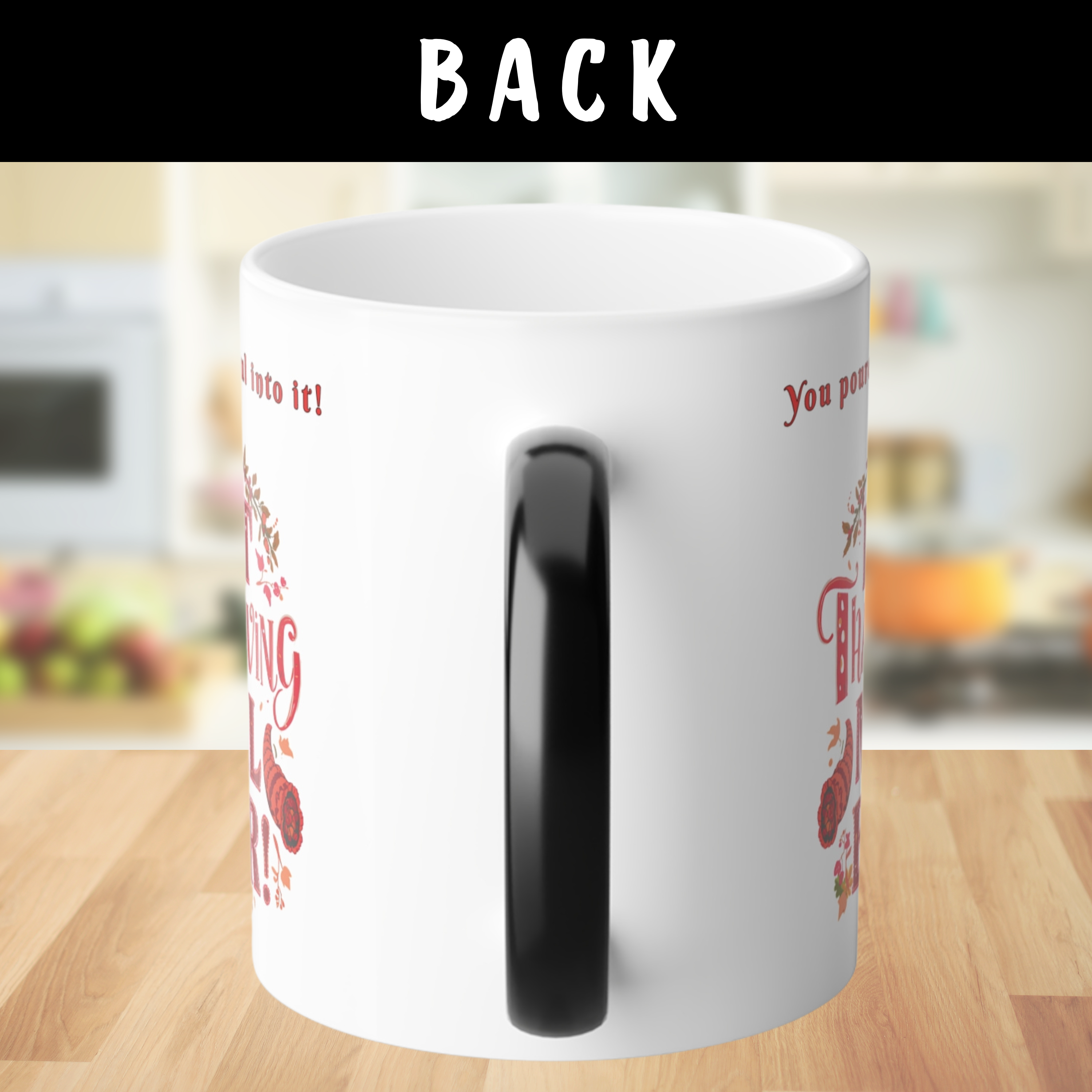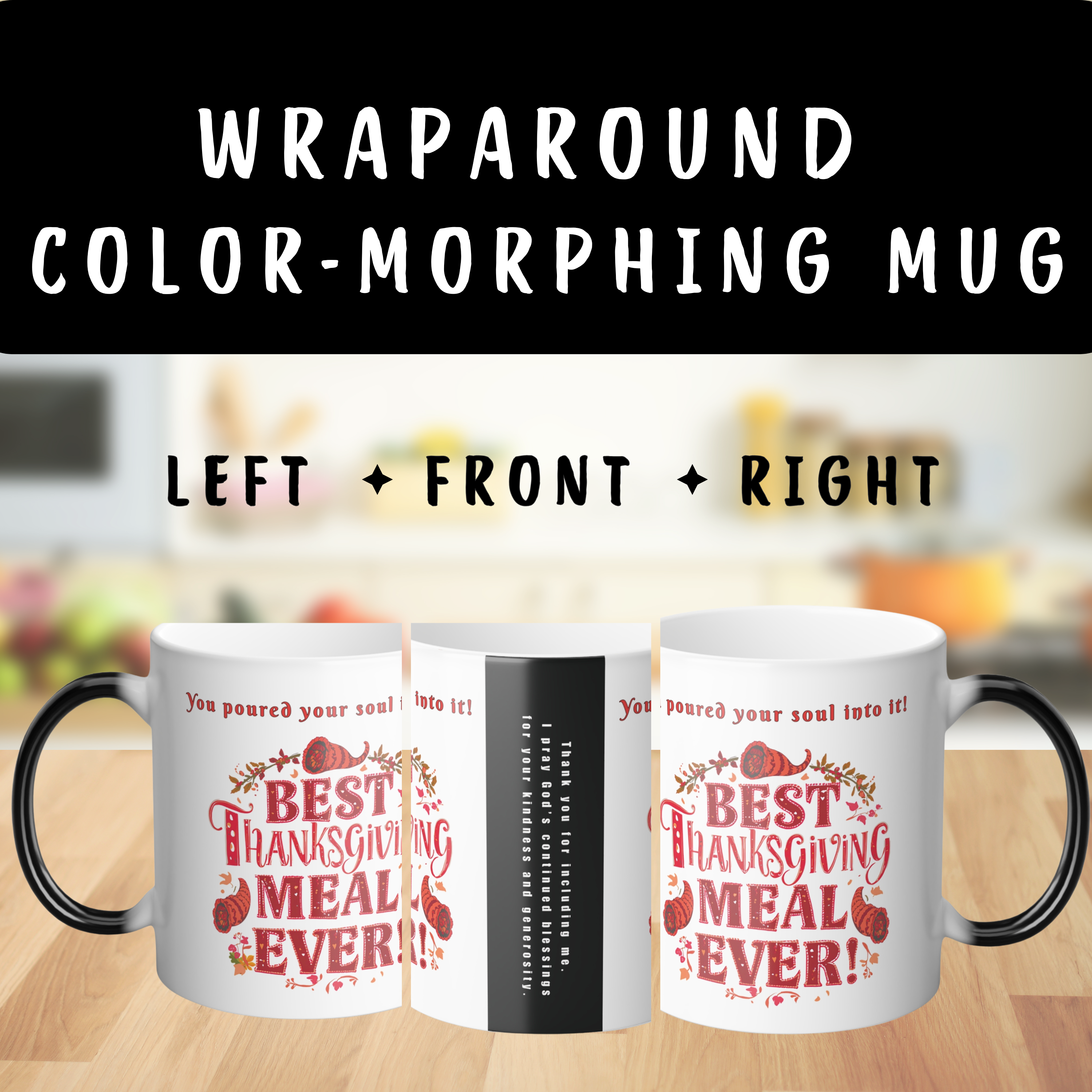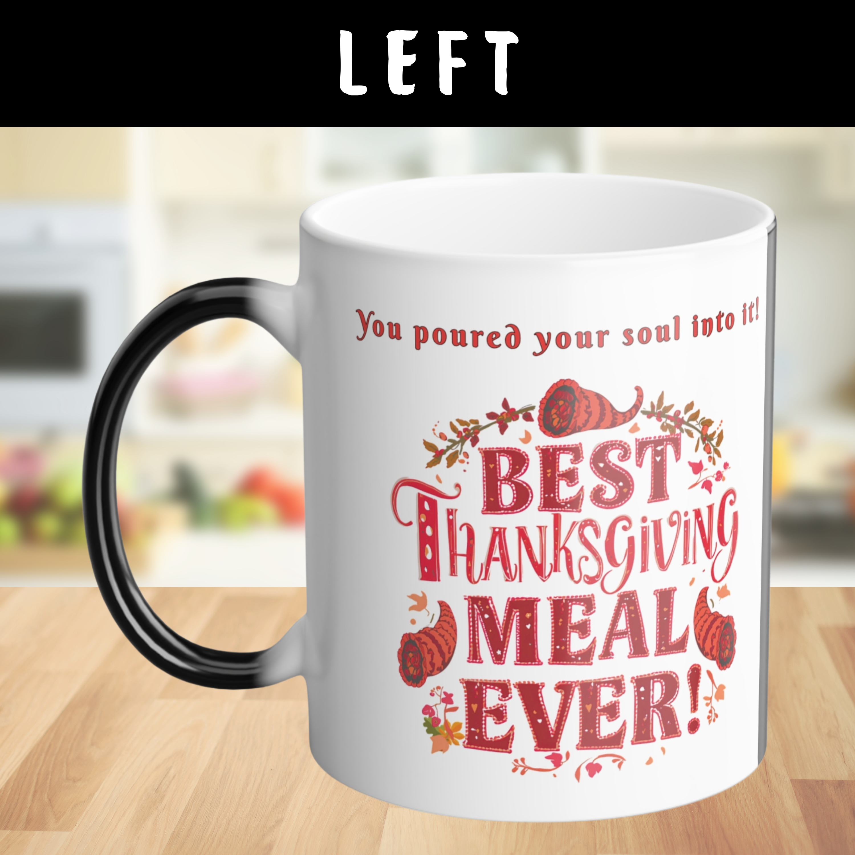 Celebrate gratitude with every sip. This personalized, color-changing, white-background Thanksgiving mug is perfect for showing appreciation to your favorite chef or host. When hot liquid is poured in, the black exterior transforms to reveal a joyful “You Poured Your Soul Into It – Best Thanksgiving Meal Ever!” design surrounded by fall motifs.