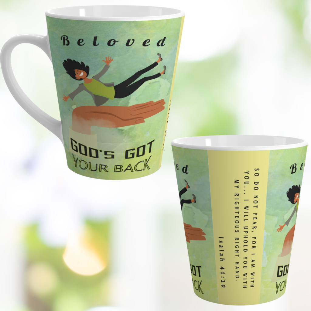 Personalizable “God’s Got Your Back” 12 Oz Christian Latte Mug Featuring Melanated Woman Falling Onto God’s Right Hand; Scripture Isaiah 41:10; Faith-Based Inspirational Gift for Women